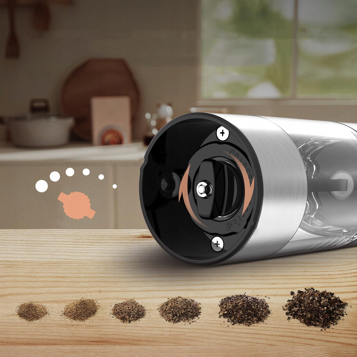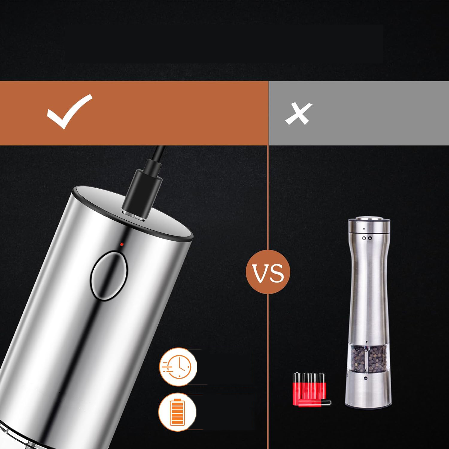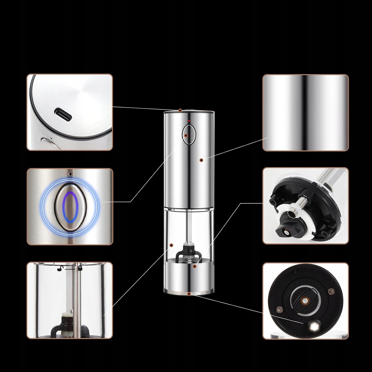 ⭐【2 электрические мельницы для перца из нержавеющей стали】: Этот продукт включает в себя 2 электрические мельницы для перца из нержавеющей стали, 1 щетку, пластиковую основу и 2 USB-кабеля для зарядки. Мельница для перца из нержавеющей стали имеет благородный внешний вид, а ручка из нержавеющей стали оливковой формы изысканна и долговечна. Увеличенная прозрачная камера объемом 95 мл, керамический шлифовальный стержень высокой твердости, высокая твердость, износостойкость и длительный срок службы.
