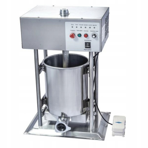 Профессиональный вертикальный электрический наполнитель для колбас от Szron емкостью 10 литров, полностью изготовлен из нержавеющей стали, предназначен для ресторанов и индивидуальных пользователей, готовящих собственные продукты. p>