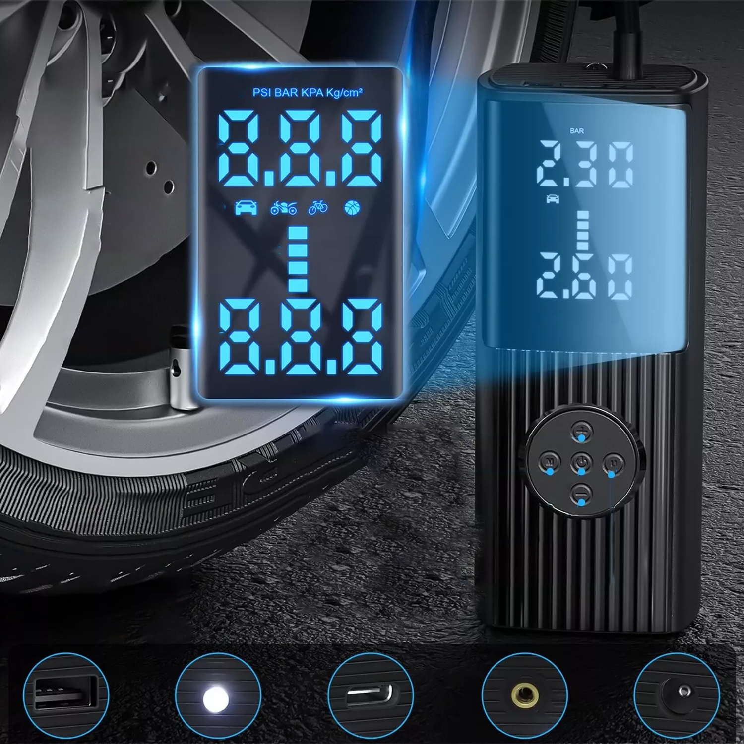 - Электрический насос шин имеет большой ЖК -экран с цифровым дисплеем, который является более четким и ярче. Это может не только надуть машину, но и заряжать телефон и действовать как фонарик.