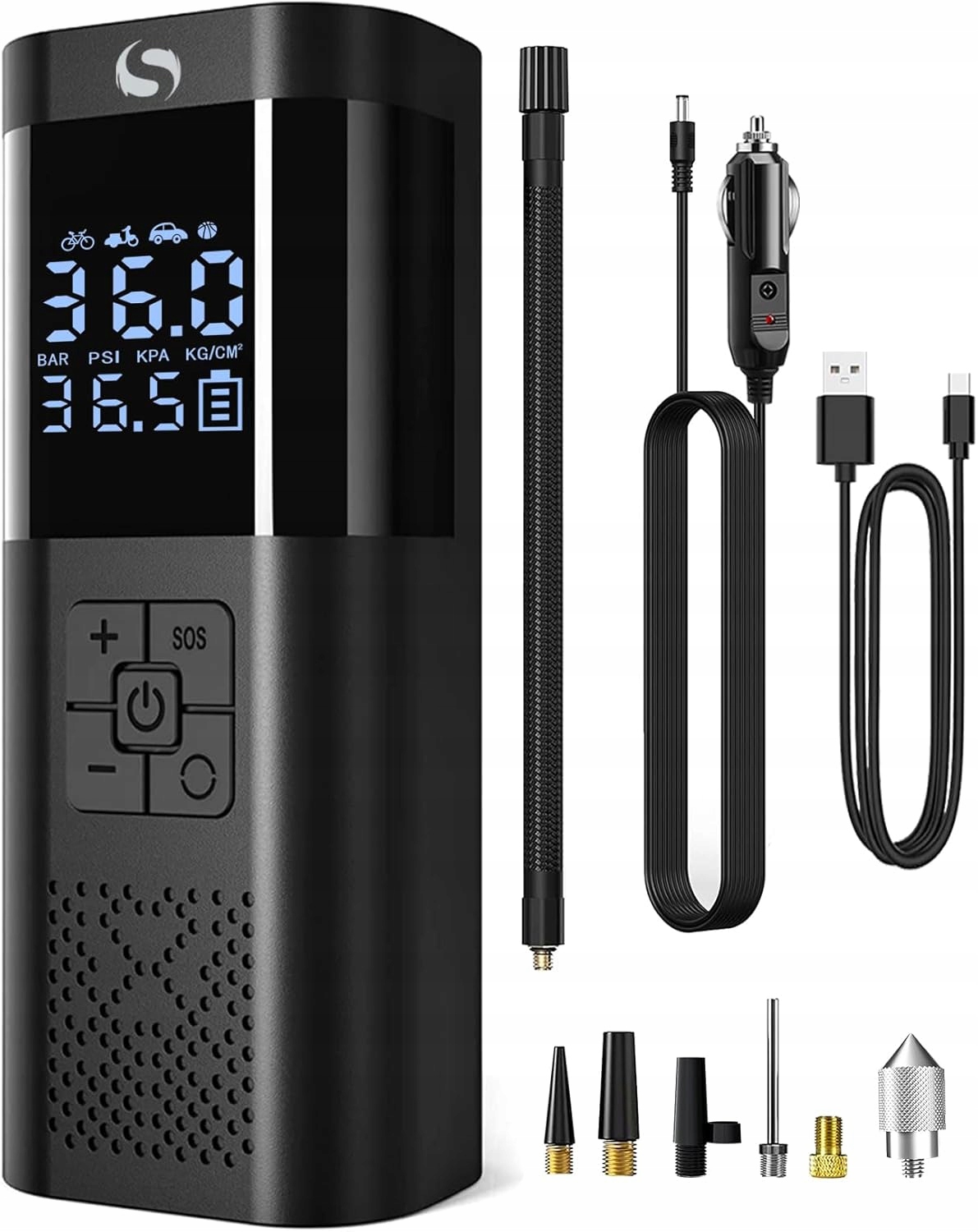 Многофункциональный: Портативный компрессор шин оснащен 5 дополнительными вспомогательными сопла для удовлетворения различных потребностей накачки. Его можно надуть различными транспортными средствами, такими как мотоциклы, велосипеды, его также можно надуть в мяч, плавающие колеса, другие надувные предметы.