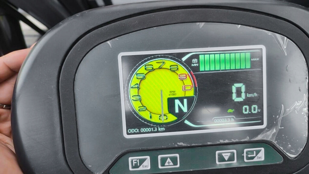 - Дисплей - это современная цветная панель с четким делением на несколько информационных разделов. Слева существует большой тахометр (об / мин) с отмеченными значениями от 0 до 10 000 революций, и внутри режима вождения виден (например, «n», что означает нейтральный). С правой стороны есть индикатор уровня заряда аккумулятора (от «мин» до «макс»), цифрового спидометра (км/ч) и напряжения тока или других параметров транспортного средства. Нижняя часть экрана включает в себя измеритель формы сигнала (ODO), рабочее время (H) и функциональные кнопки (F1/ESC, +/- и установка), позволяющие изменять настройки или отображать информацию. Целое является прозрачным и интуитивно понятным, что облегчает работу машины.