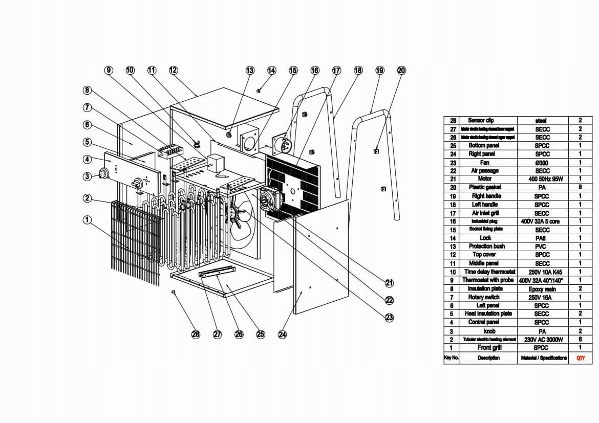 - 4 режима работы: подача воздуха, мощность нагрева 5кВт, мощность нагрева 10кВт, мощность нагрева 15кВт.