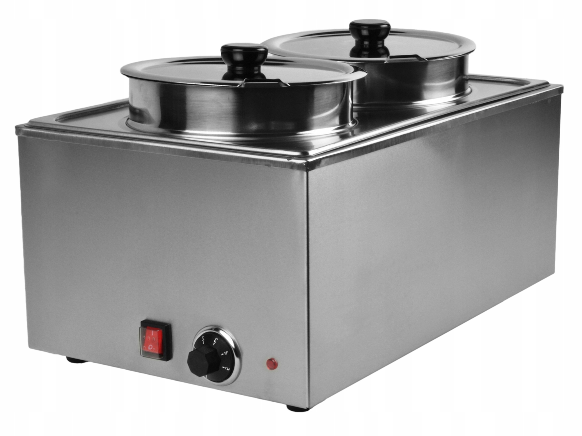 Бейн-мари для общественного питания, оснащенный двумя чайниками из нержавеющей стали емкостью 7 литров. Баня изготовлена из нержавеющей стали. Он предназначен для поддержания необходимой температуры предварительно приготовленных блюд, что делает его идеальным для всех типов предприятий общественного питания: столовых, общепита, ресторанов, гостиниц, больниц и т.д.
