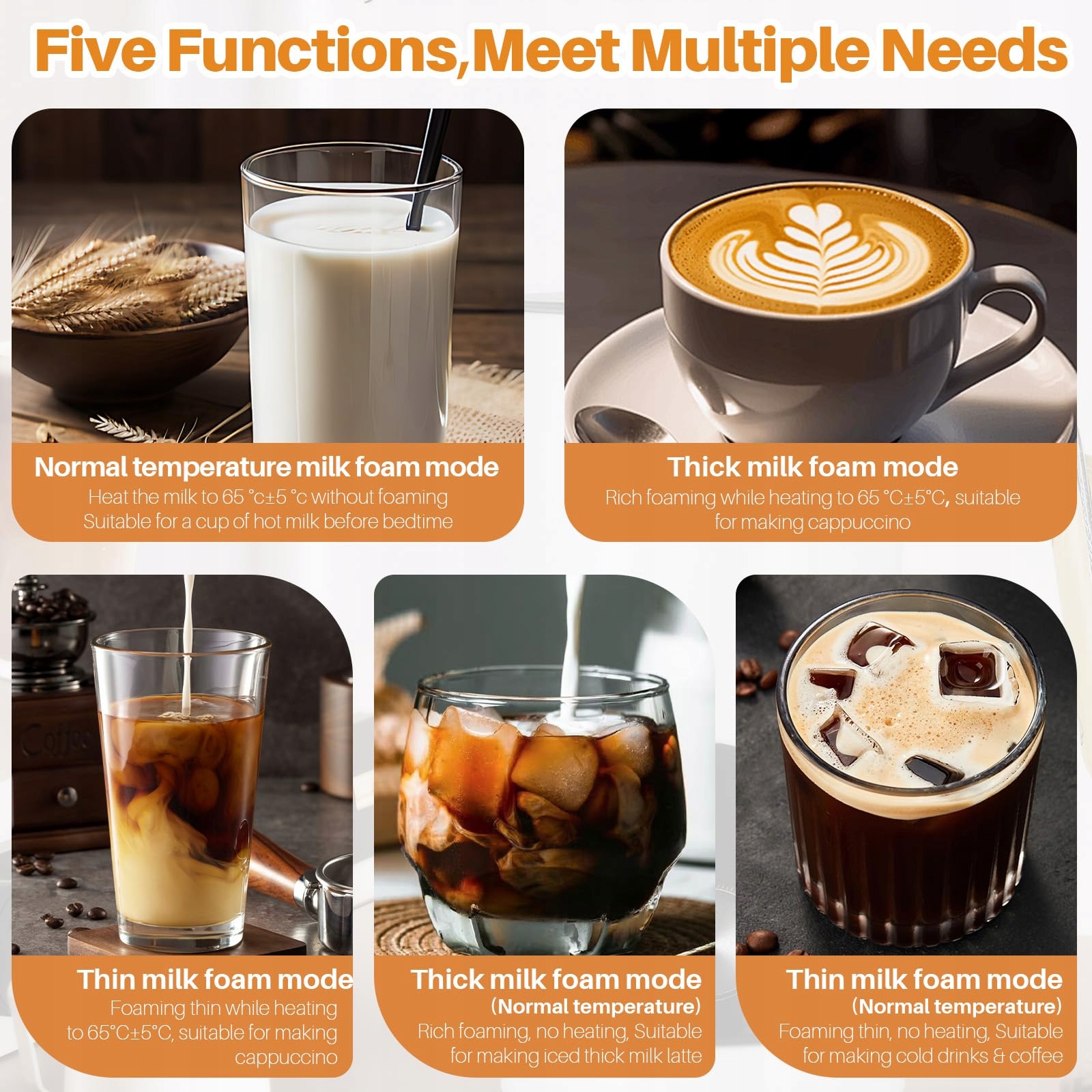 【5 УНИВЕРСАЛЬНЫХ ФУНКЦИЙ 5-В-1 МОЛОЧНОЙ Вспениватель И ПАРОВОДКА】 Наш вспениватель молока, идеально подходящий для любителей кофе любого уровня, предлагает пять универсальных функций: теплая, густая пена, теплая, пышная пена, холодная пена, горячее молоко и горячий шоколад. Благодаря простому управлению одним касанием вы можете дома наслаждаться напитками бариста, такими как капучино, латте и маккиато.