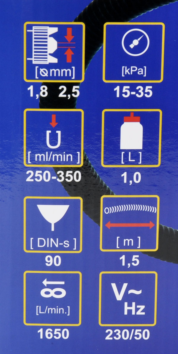 - гибкий шланг, пистолет с бачком, сопла 1,8, 2,5 мм, плотномер DIN/S, плечевой ремень, руководство пользователя.