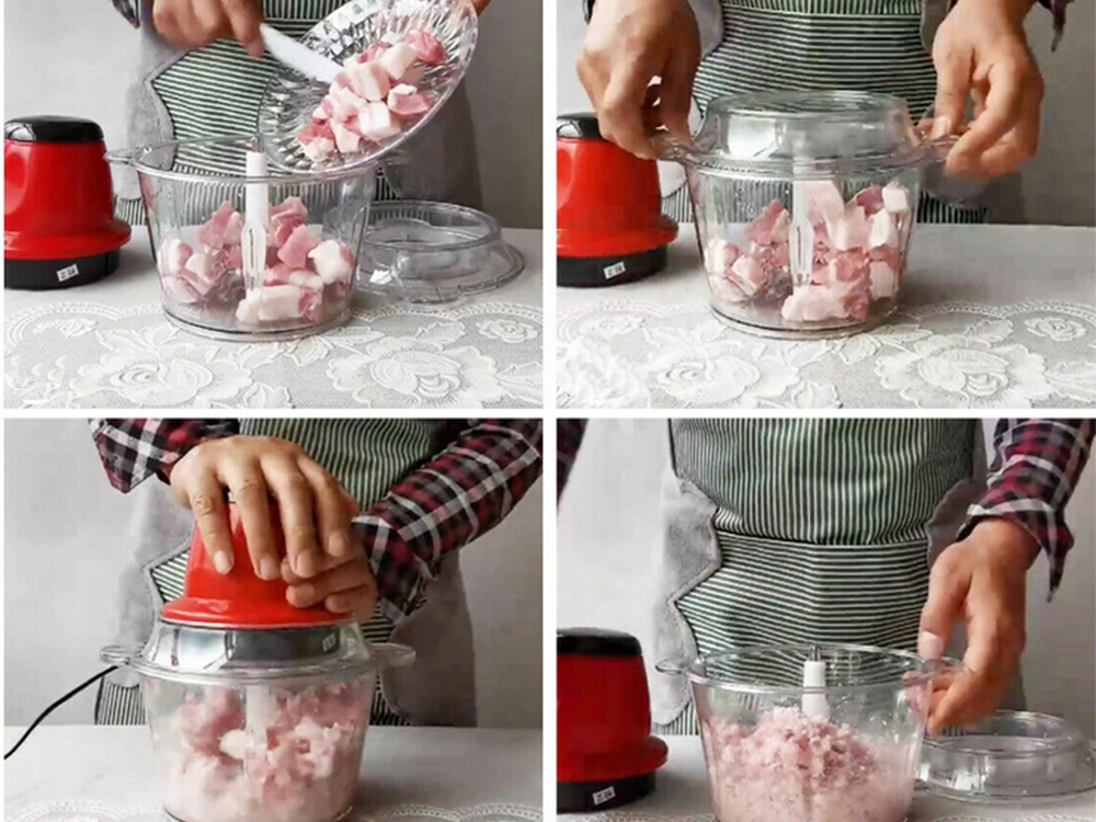 Измельчитель очень прост в использовании. Просто поместите ингредиенты, необходимые в контейнере, подключитесь к источнику питания, и с помощью кнопки в верхней части устройства будут запущены вертолом