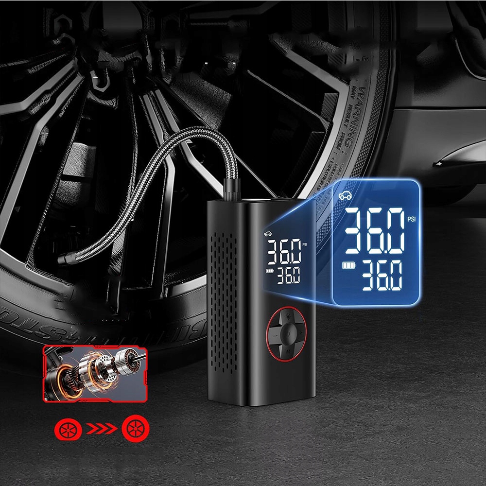 -Оборудован батареей 100 000 мАч, которая после одного полного заряда может надуть шесть автомобильных шин 195/55/R15 (0-36 фунтов на квадратный дюйм).