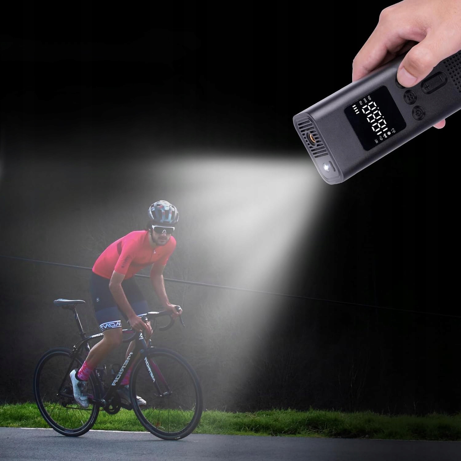 - Велосипед с компрессором аккумулятора оснащен автоматической функцией переключения после установки определенного давления (автоматически отключает после заполнения батареи) и функцией обнаружения давления в шинах. Благодаря этому вы получаете большую безопасность и предотвращаете чрезмерное раздувание.