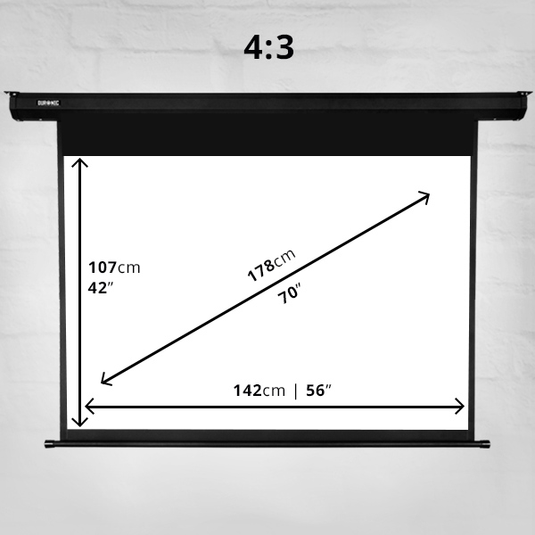 - Компания Duronic предлагает проекционные экраны во многих вариантах и размерах. На этом аукционе представлен фон размером 107 х 142 см, что дает изображение размером 70 дюймов (диагональ 178 см). Коврик имеет соотношение сторон 4:3, а это значит, что вы сможете с комфортом смотреть фильмы и сериалы. Проекционная поверхность выполнена по технологии Matt White, что гарантирует идеальный белый фон и матовое изображение. Общая длина экрана 185 см. Изделие изготовлено из материала, препятствующего образованию пыли и плесени, устойчивого к нагреванию.