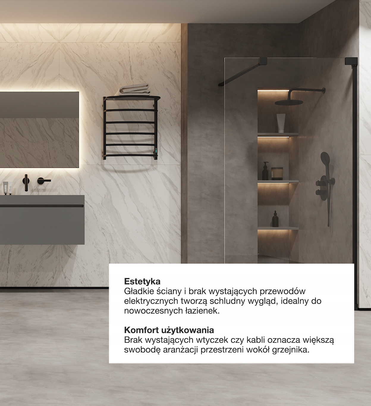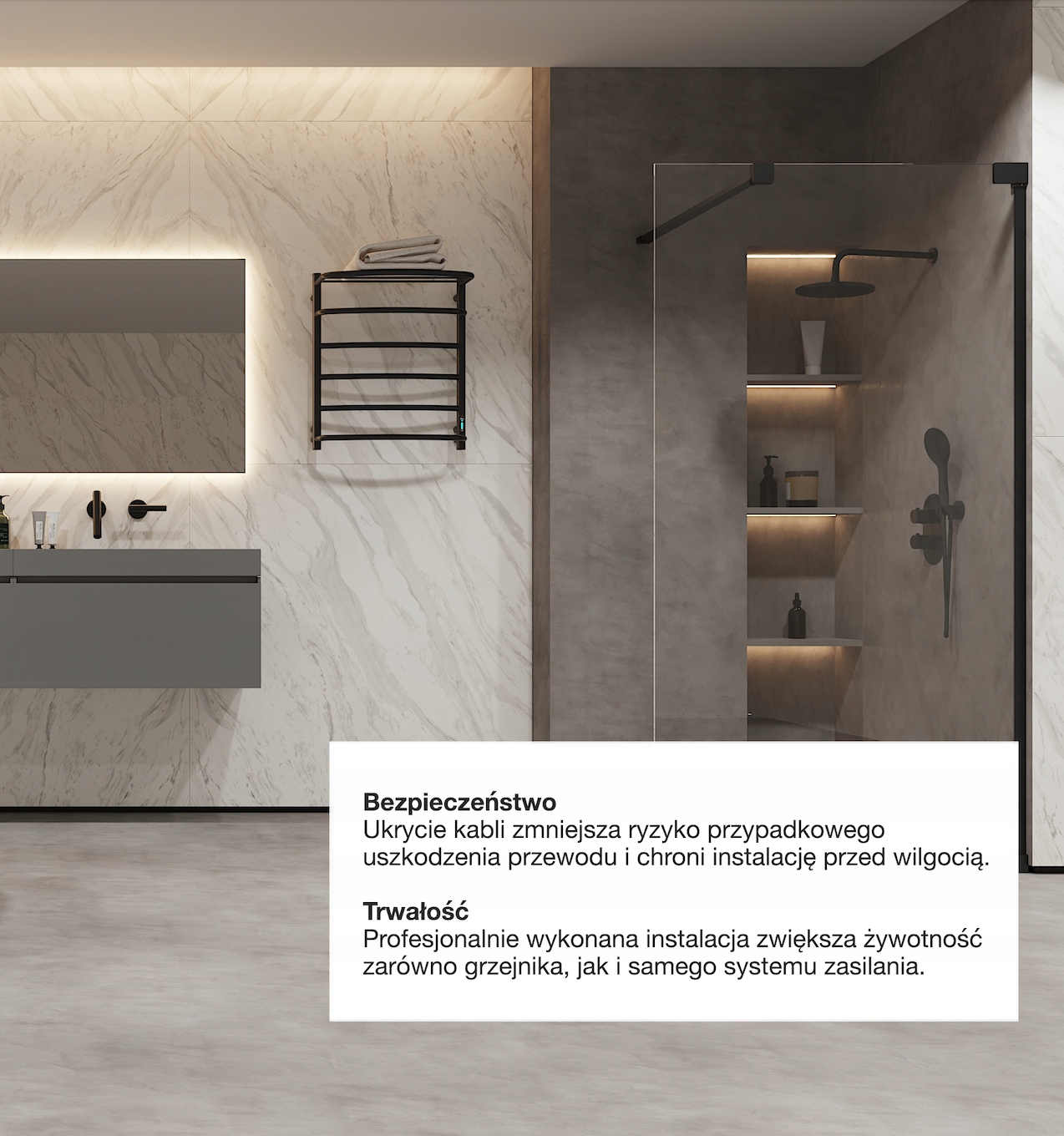 Благодаря современной технологии скрытого скрытого монтажа, вы установите электрическую сушилку для ванной комнаты Elna, без подъема питания, висящего снаружи, соединяя кабель, выступающий от радиатора прямо к кабелям электрической установки, оставляя стену. Это решение сводит к минимуму любые возможные опасные действия, связанные с использованием электрических устройств в комнатах с высоким уровнем влажности.