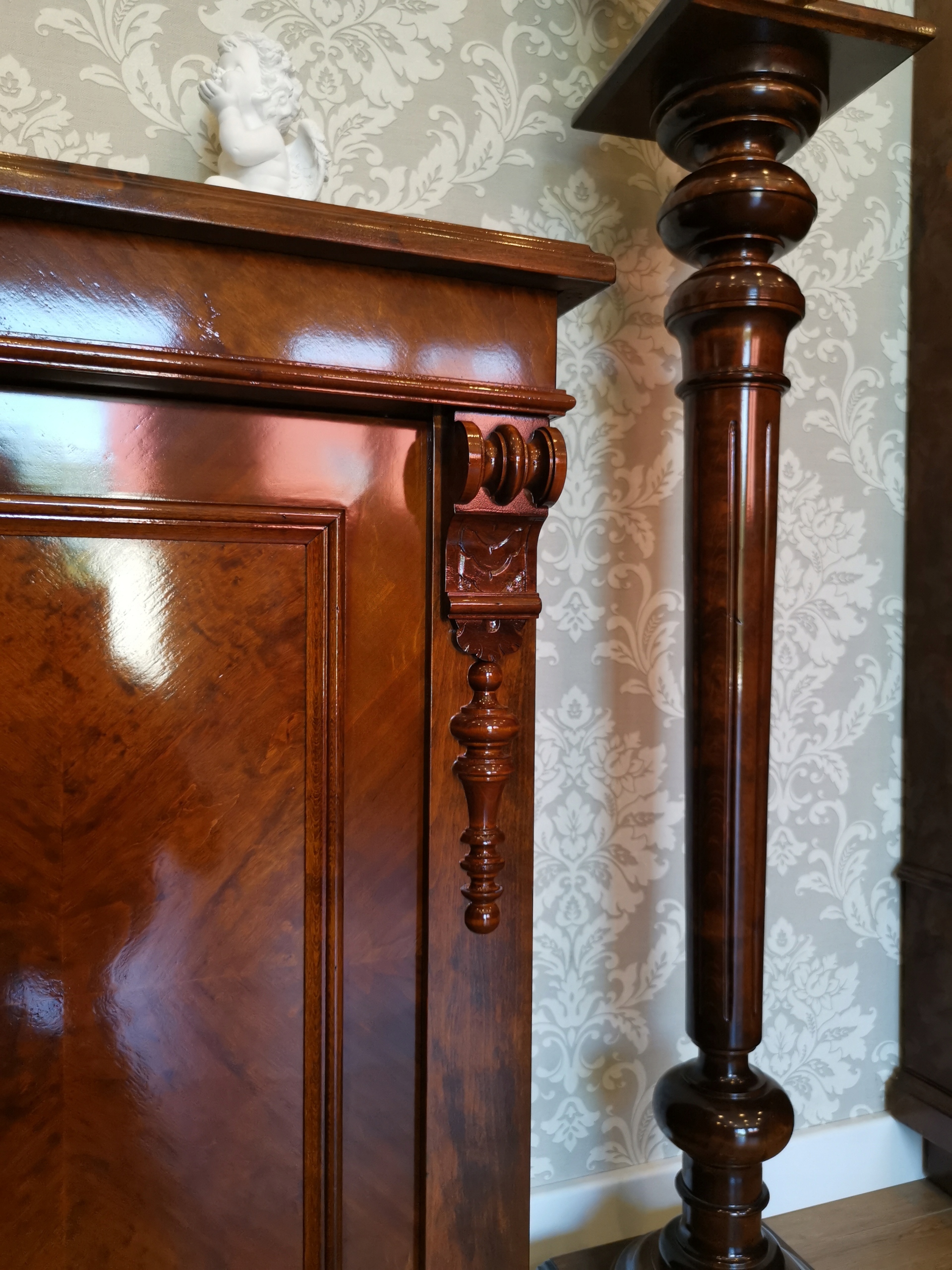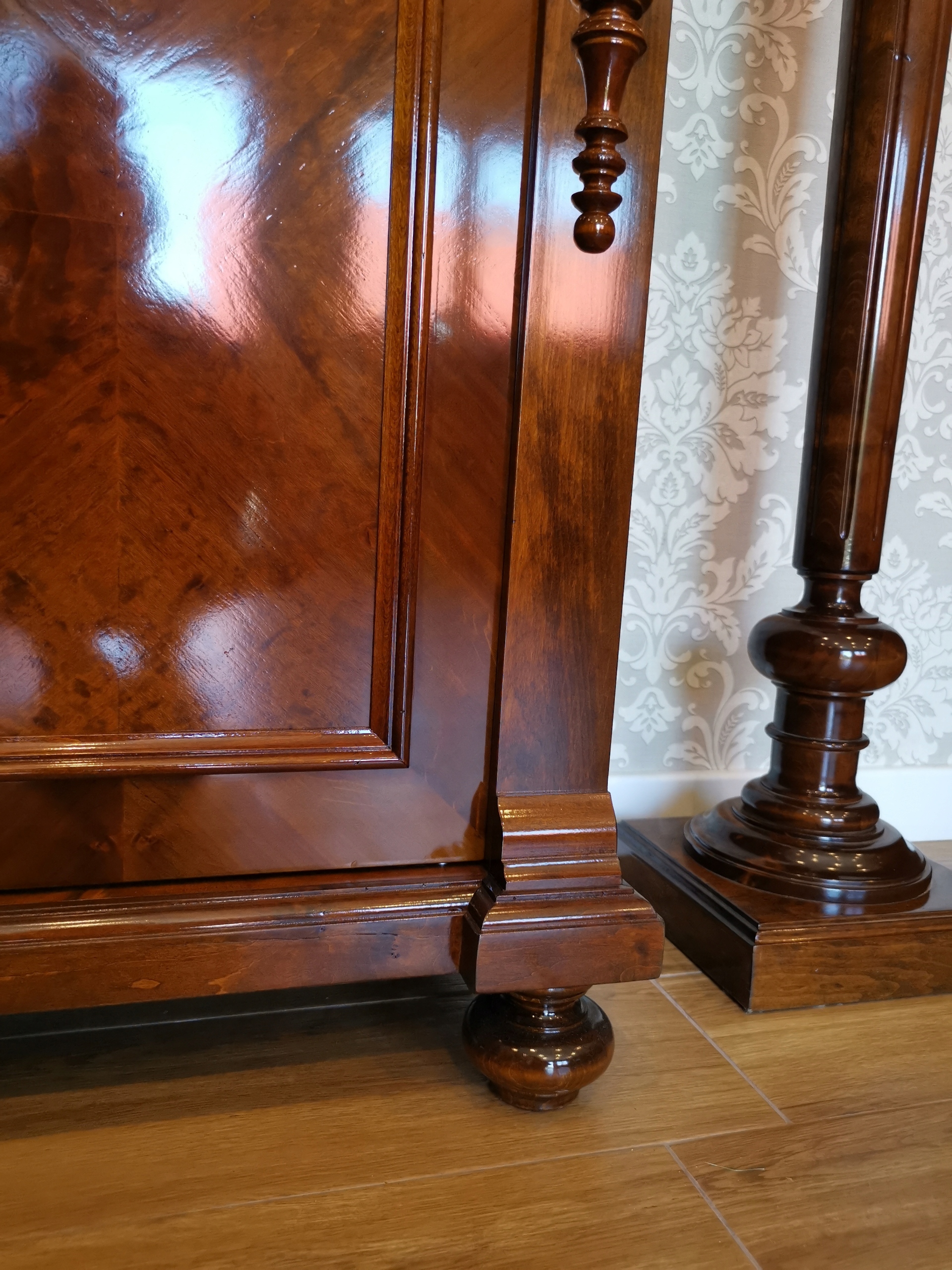 Предлагаем Вам кабинет в стиле эклектика. Мебель облицована ореховым шпоном, крашеным орехом и отделана глянцем. Шкаф имеет две дверцы, нежный эклектичный декор и точеные ножки.