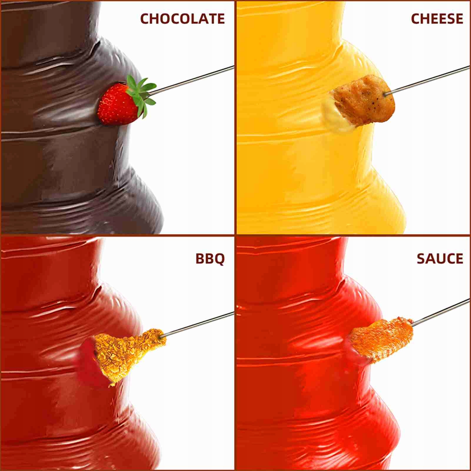 1. Универсальное использование: наш 3 -летний фонтан с подносом отлично подходит для таяния около 200 г/ 7,05 унций шоколада и сладостей. Удобно погрузить различные деликатесы.