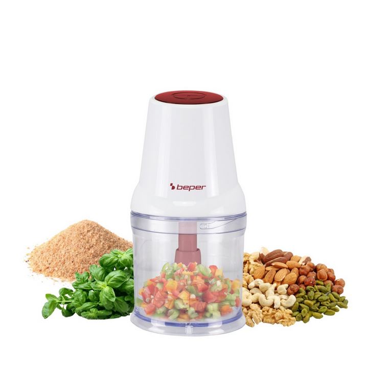 Кухонный комбайн BEPER P102ROB010 с двумя лезвиями, пластиковый контейнер мощностью 400 Вт, 500 мл, лезвия из нержавеющей стали для равномерного измельчения, система безопасности и нескользящие ножки.