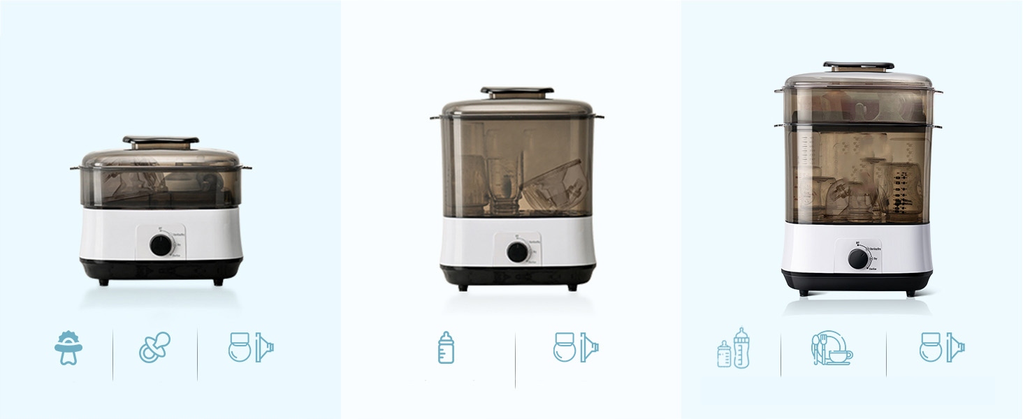 Вы можете использовать только основной слой, только верхний слой или оба слоя одновременно. Может использоваться как набор стерилизатора/сушилки, набор стерилизатора/сушилки, набор сушилки или система хранения. Идеально подходит для повседневного использования, обычно несколько раз в день.