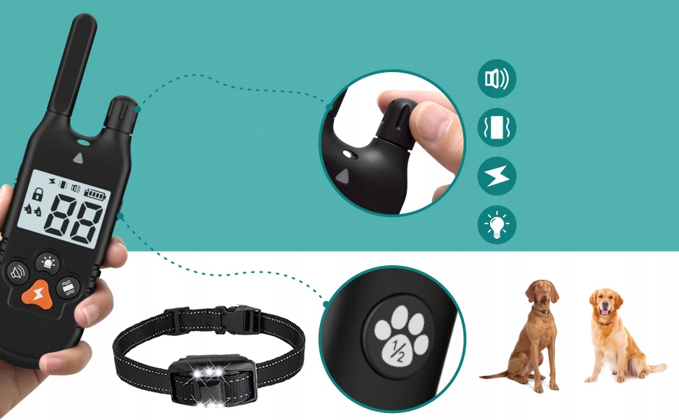 -с большим ЖК-дисплеем, простым в использовании и эксплуатации, четко отображая режим, уровень, срок службы батареи и канал, который позволяет легко и безопасно определять правильный уровень вибрации или амортизатора собак. - Встроенный светодиодный свет в приемнике помогает найти собаку даже в темной обстановке, легко найти собаку, когда она прячется. Убедитесь, что безопасность вашей собаки, идеально подходящей для ночных прогулок.