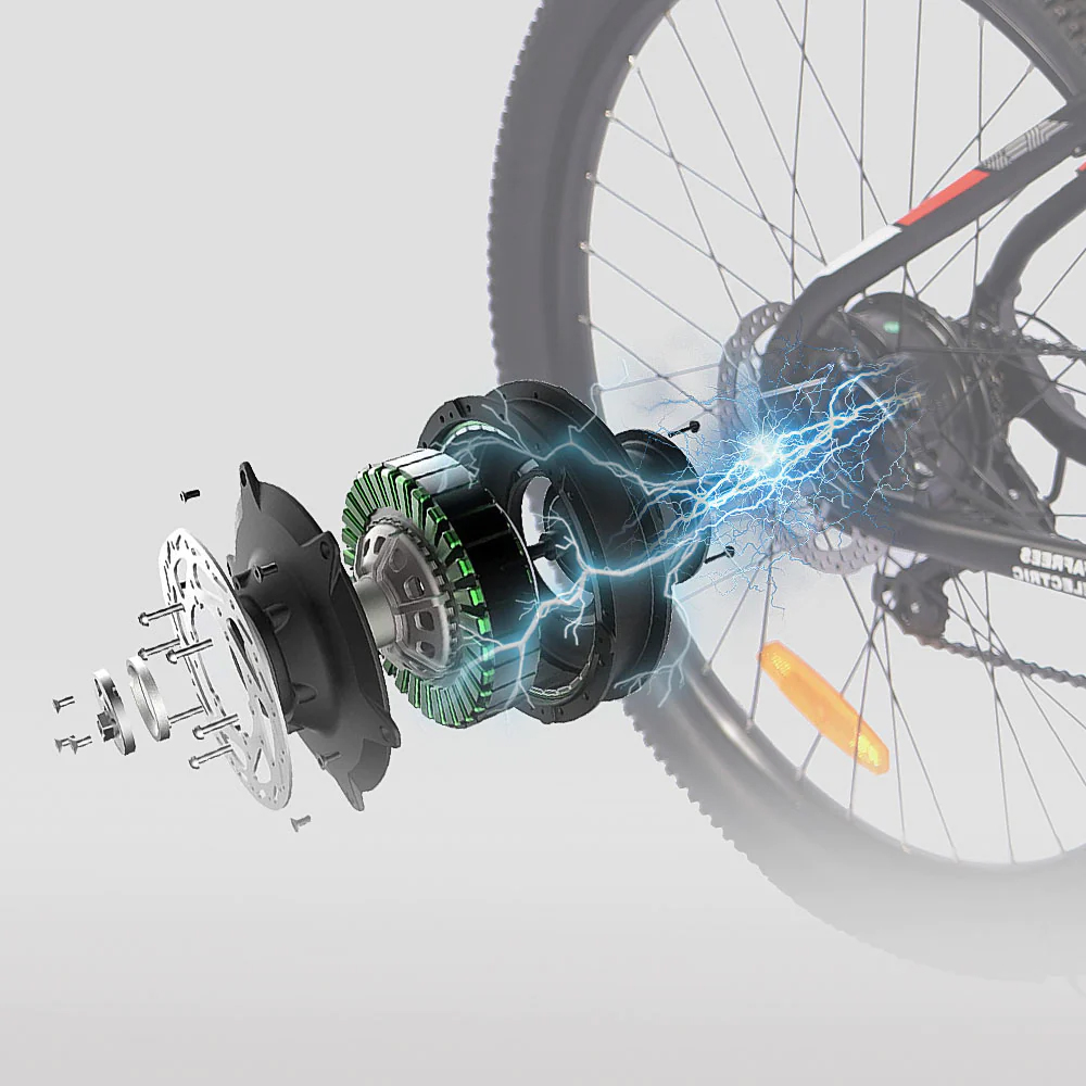 Бесщеточный двигатель 350 Вт с максимальным крутящим моментом 45 Нм и интеллектуальным контроллером обеспечивает максимальную скорость 33 км/ч. Он имеет три уровня помощи педали для быстрого запуска и подзарядки.