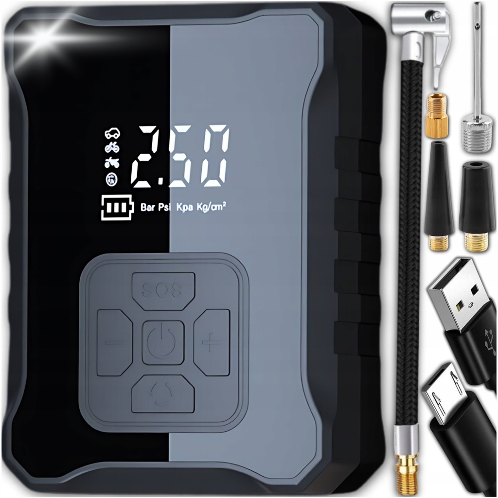 Портативный компрессор имеет прочный корпус, большая емкость батареи и оснащен фонариком, благодаря которого он отлично работает в различных, неожиданных ситуациях. энергия