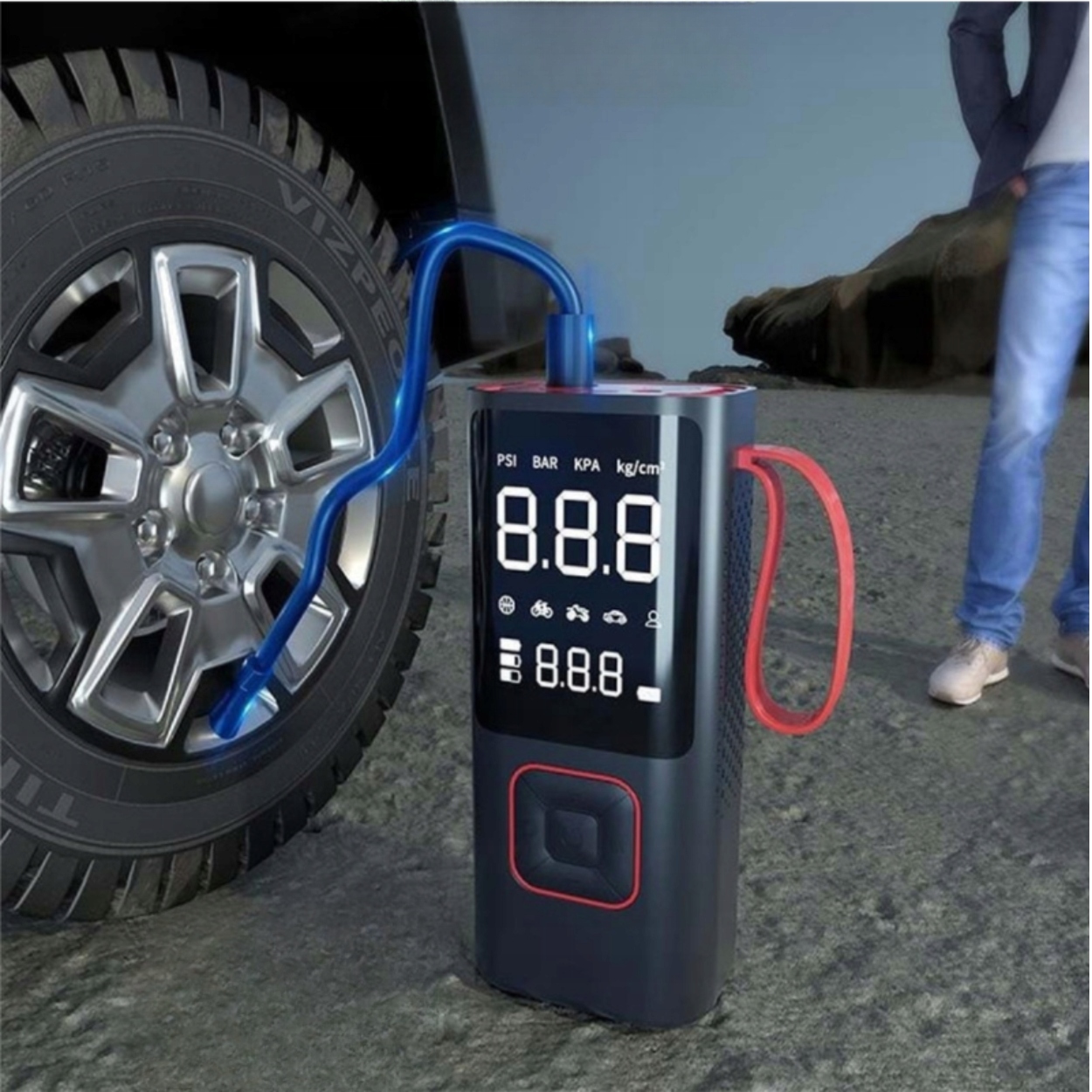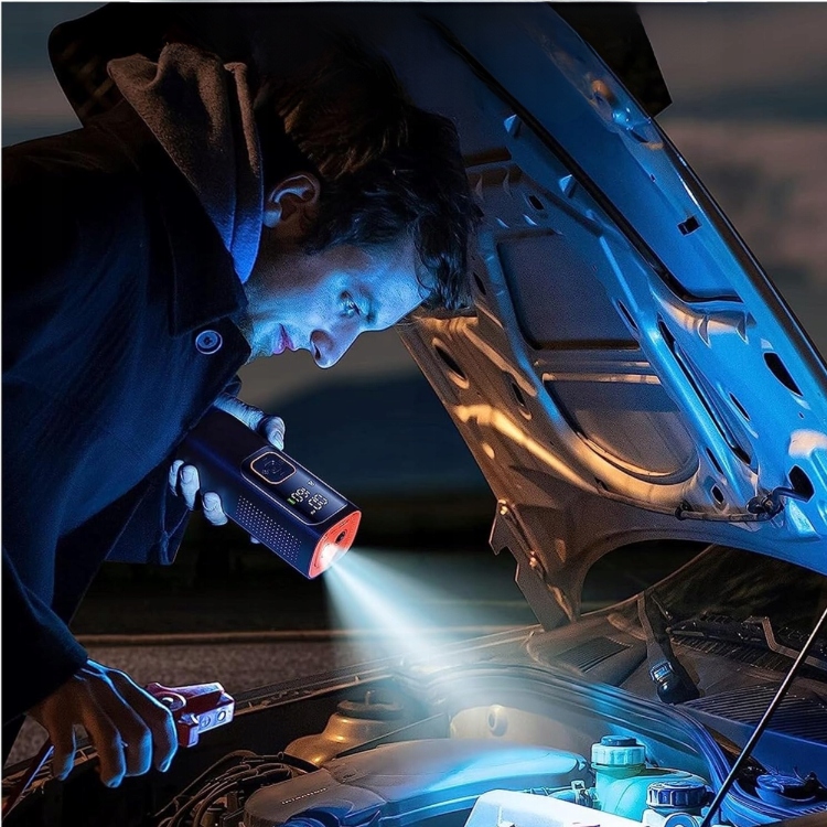 Компрессор беспроводной батареи 80 Вт с большой батареей 7800 мАч, 4 наконечника в наборе и встроенный фонарик - компактный, универсальный и готов к использованию в аварийных ситуациях.