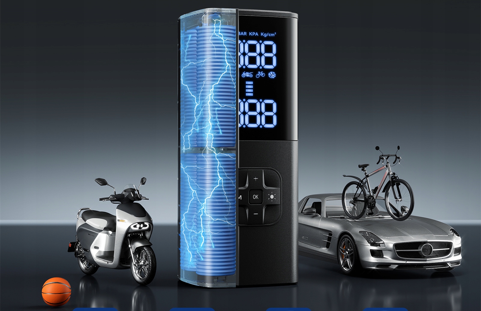 - Этот продукт имеет четыре режима надувания: для транспортных средств, мотоциклов, велосипедов и мячей. Вы можете выбрать подходящий режим в соответствии с вашими потребностями.