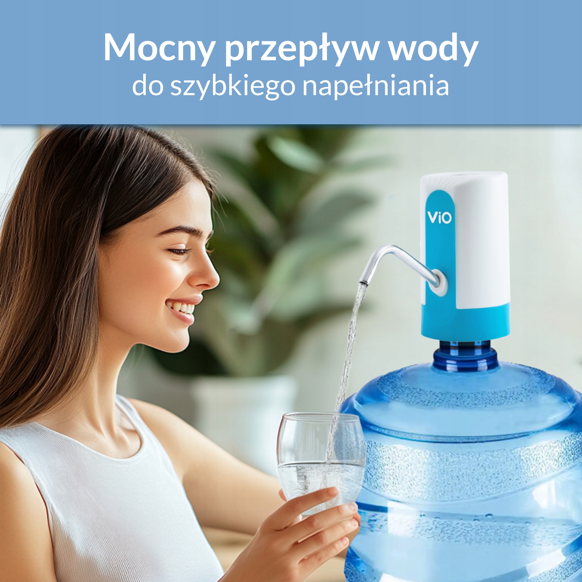 - Эргономичный дизайн: благодаря белым и синим цветам, насос Vio E9 идеально сочетается с различными интерьерами. Это практичный и эстетический дозатор воды.