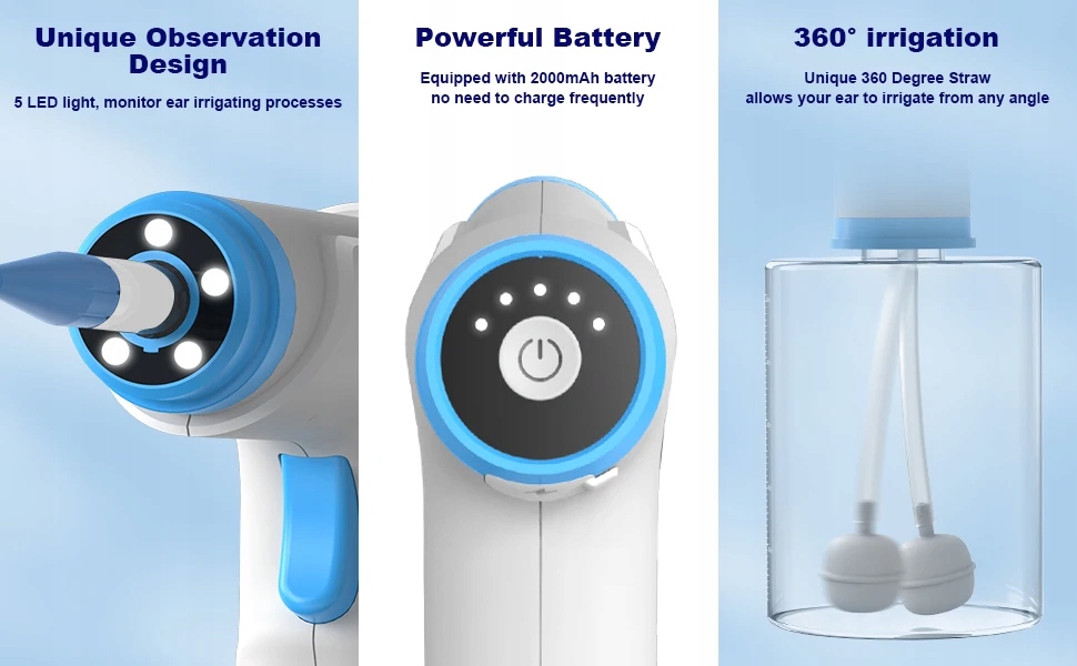 4. Встроенный литиевый аккумулятор емкостью 2000 мАч со сроком службы до 6 месяцев, позволяющий удобно промывать уши в любое время и в любом месте.