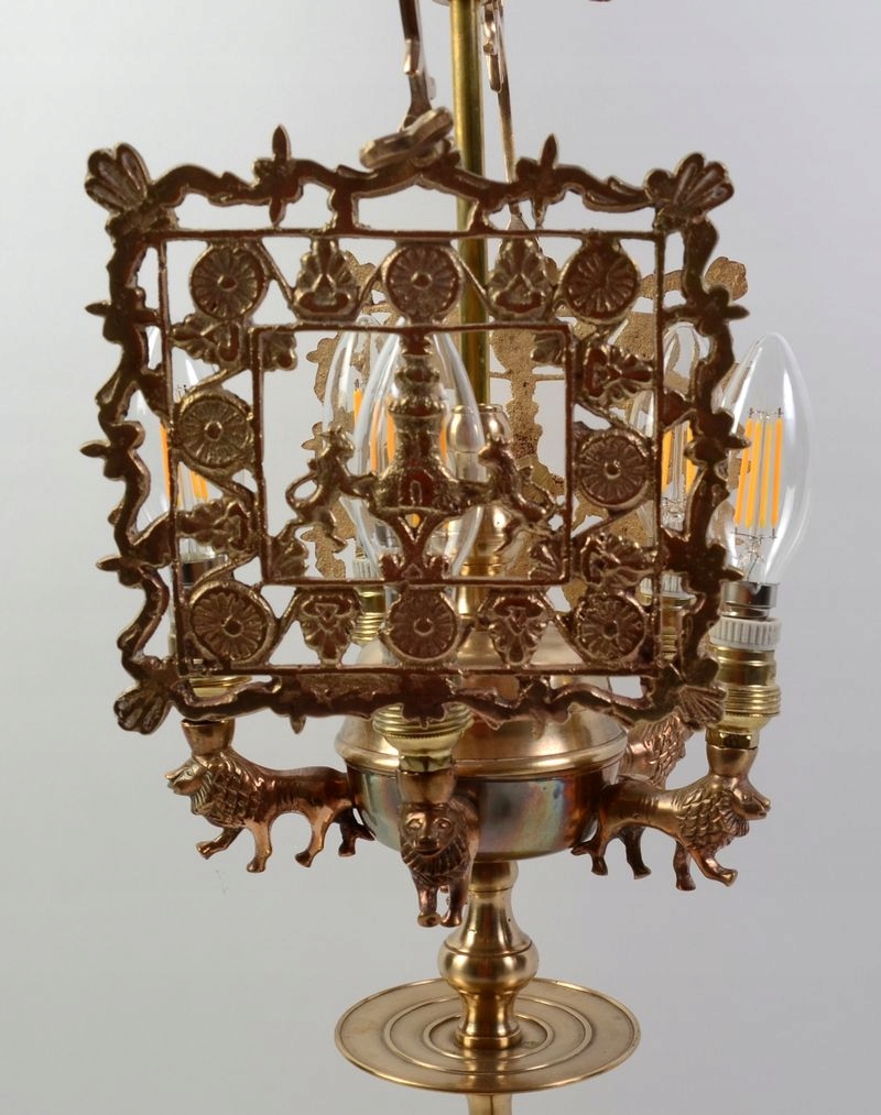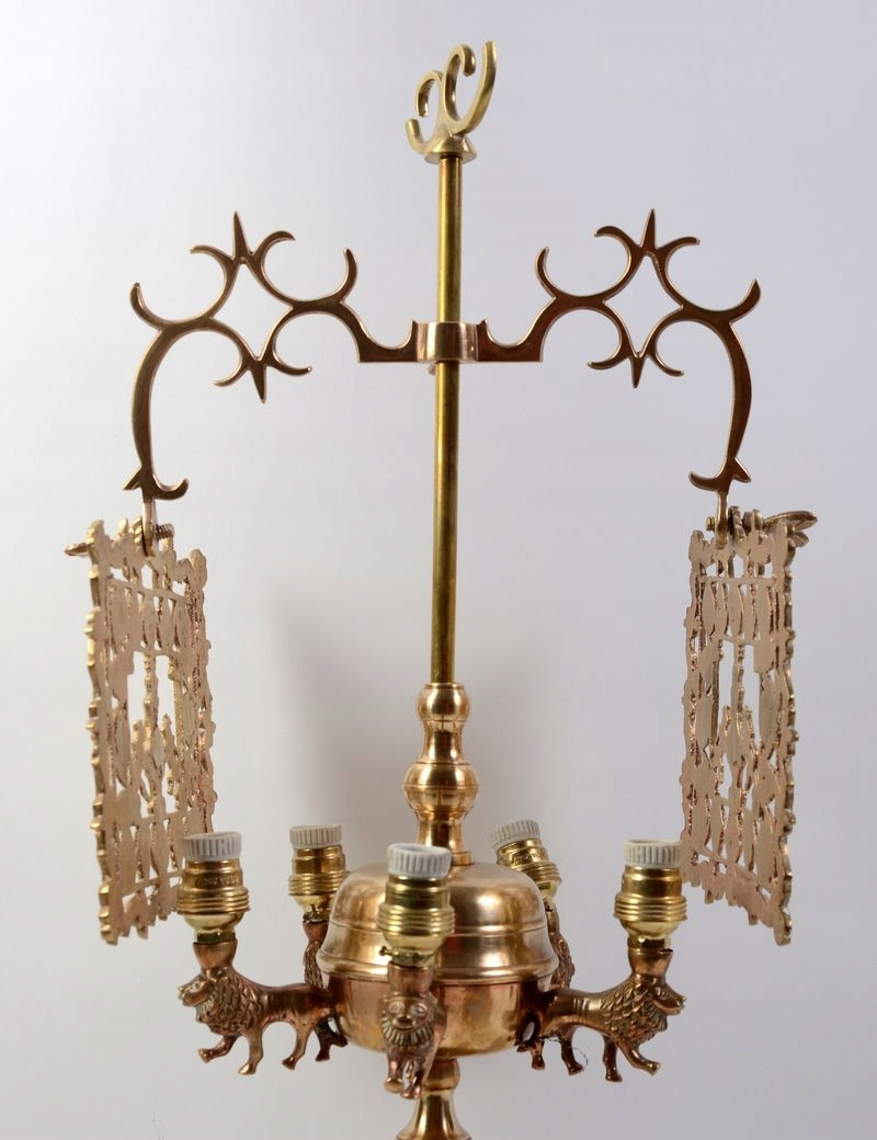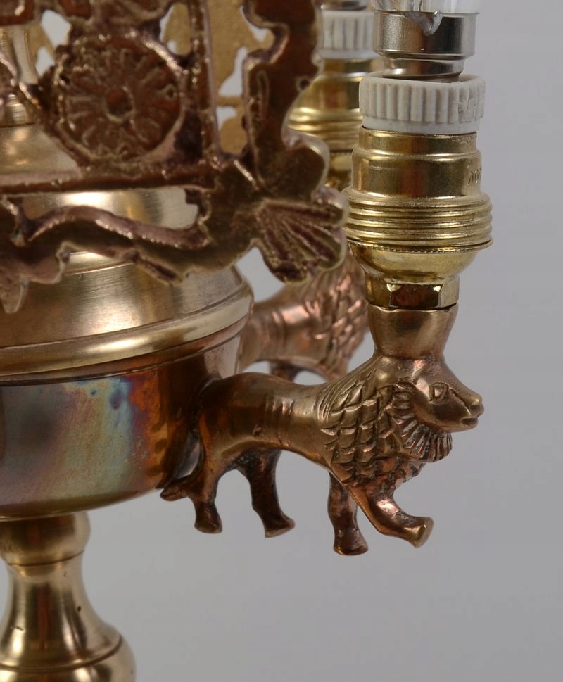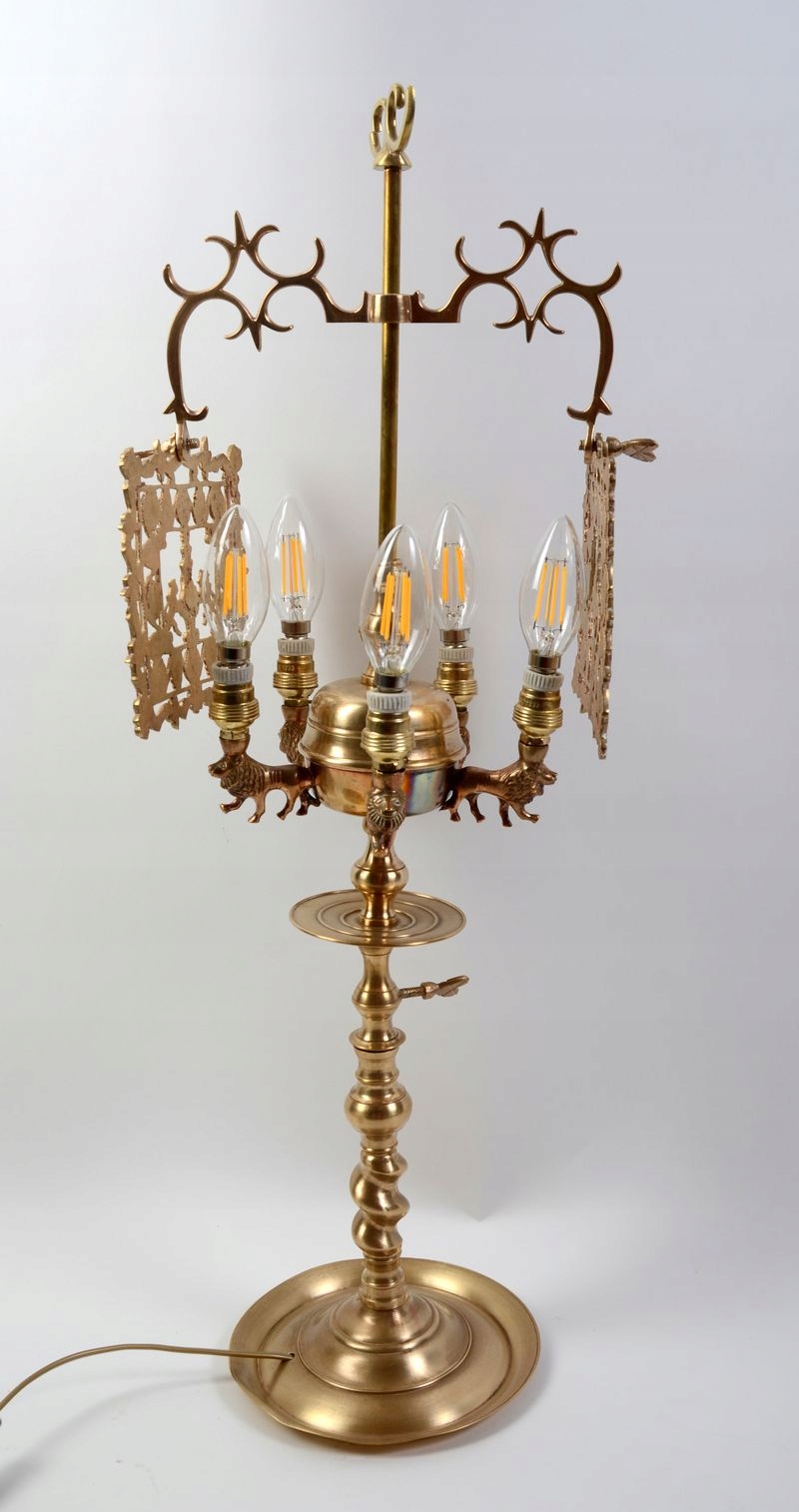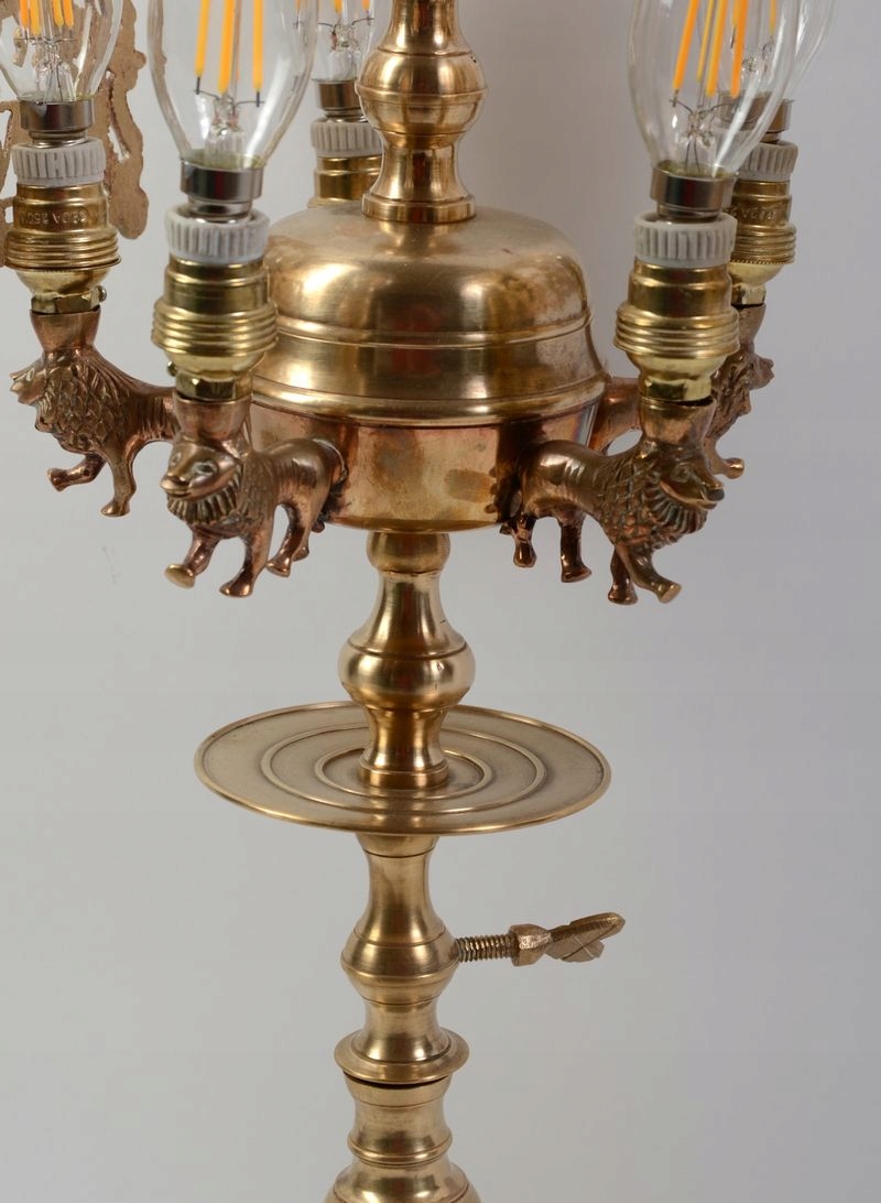 Предметом продажи является стильная старинная масляная лампа из Испании первой половины 20 века. Лампа электрифицирована – в результате она имеет пять световых точек, дающих большое количество света (лампочки Е-14). Каждый мельчайший элемент усовершенствован. Лампа изготовлена из бронзы золотистого цвета. Он оснащен всеми аксессуарами (которые слегка висят), необходимыми для работы масляной лампы. Изделие имеет достаточно устойчивое круглое декоративное основание, обеспечивающее безопасность. Светильник дополнительно украшен ажурными крышками и оригинальным концом дужек с фигуркой льва, что придает изделию уникальность. Светильник порадует каждого своей оригинальностью и добавит элегантности и стиля любому интерьеру. Однозначно рекомендую!!! Учитывая тот факт, что когда-то это была масляная лампа, часть, служащая канистрой, и крышка до сих пор являются подвижной частью. К светильнику прилагается сертификат галереи Россар, подтверждающий место и время происхождения предмета.