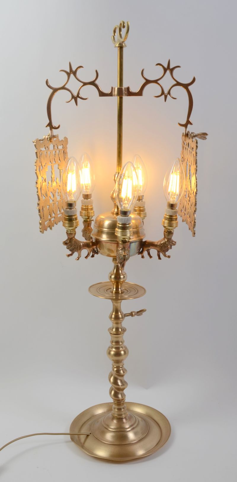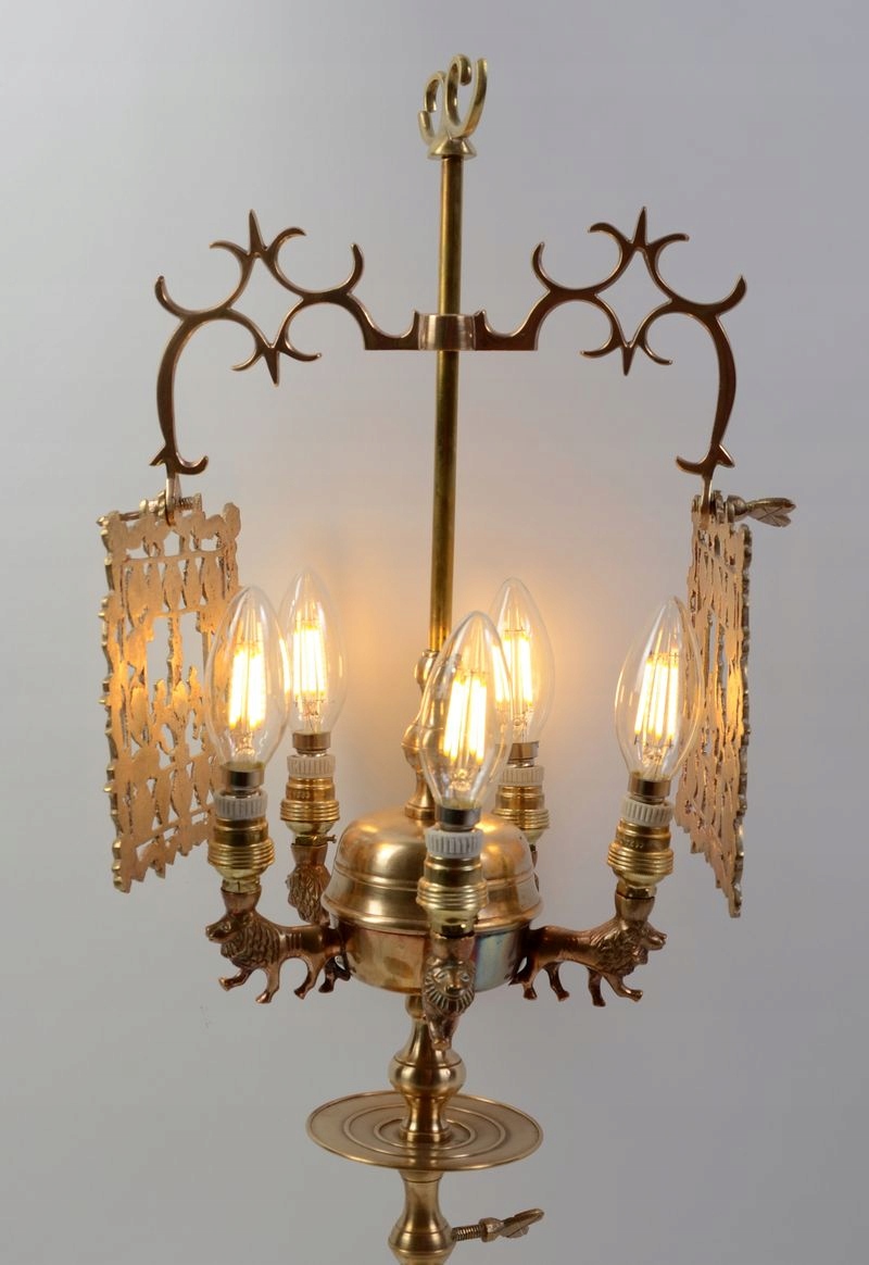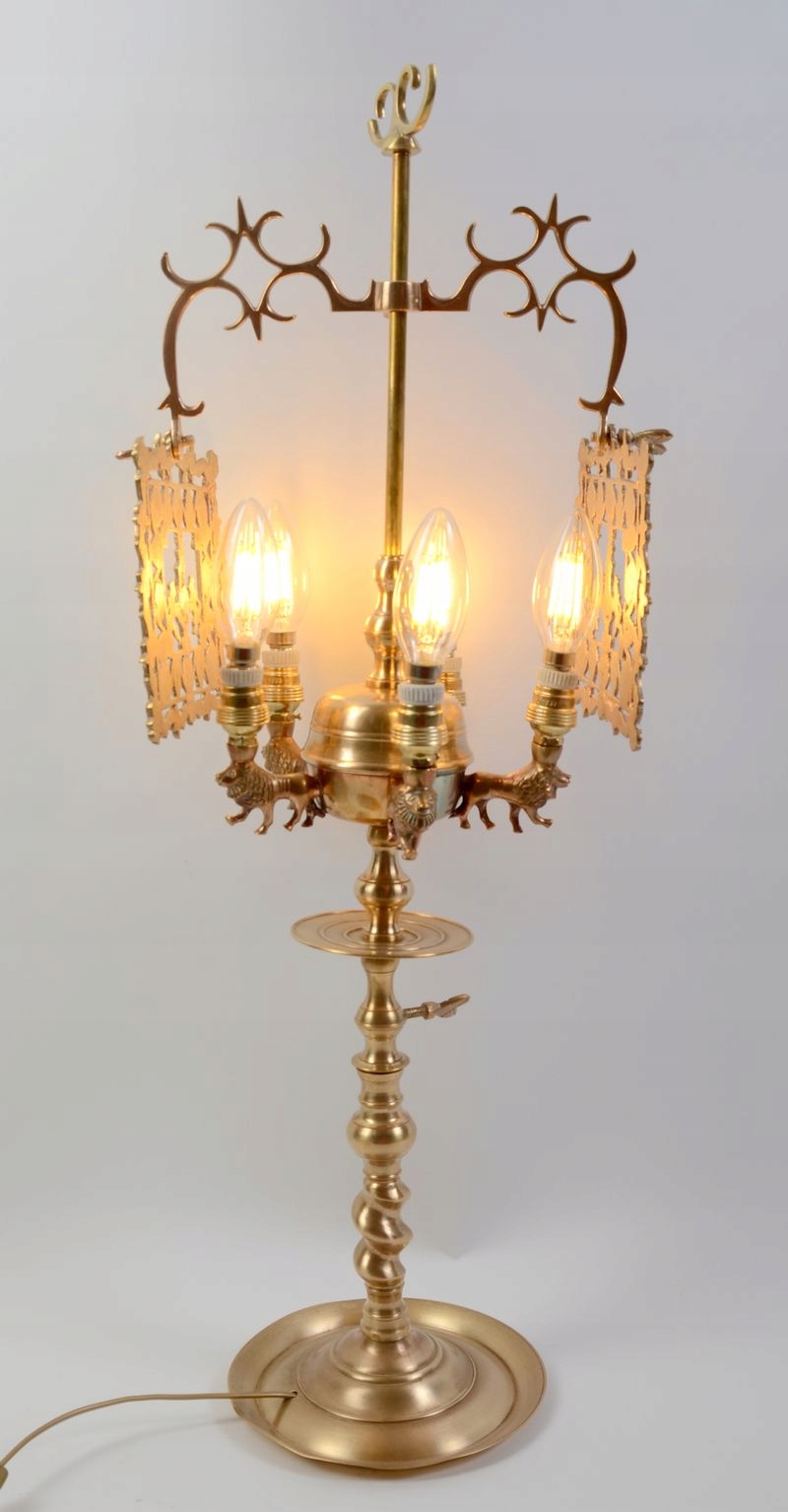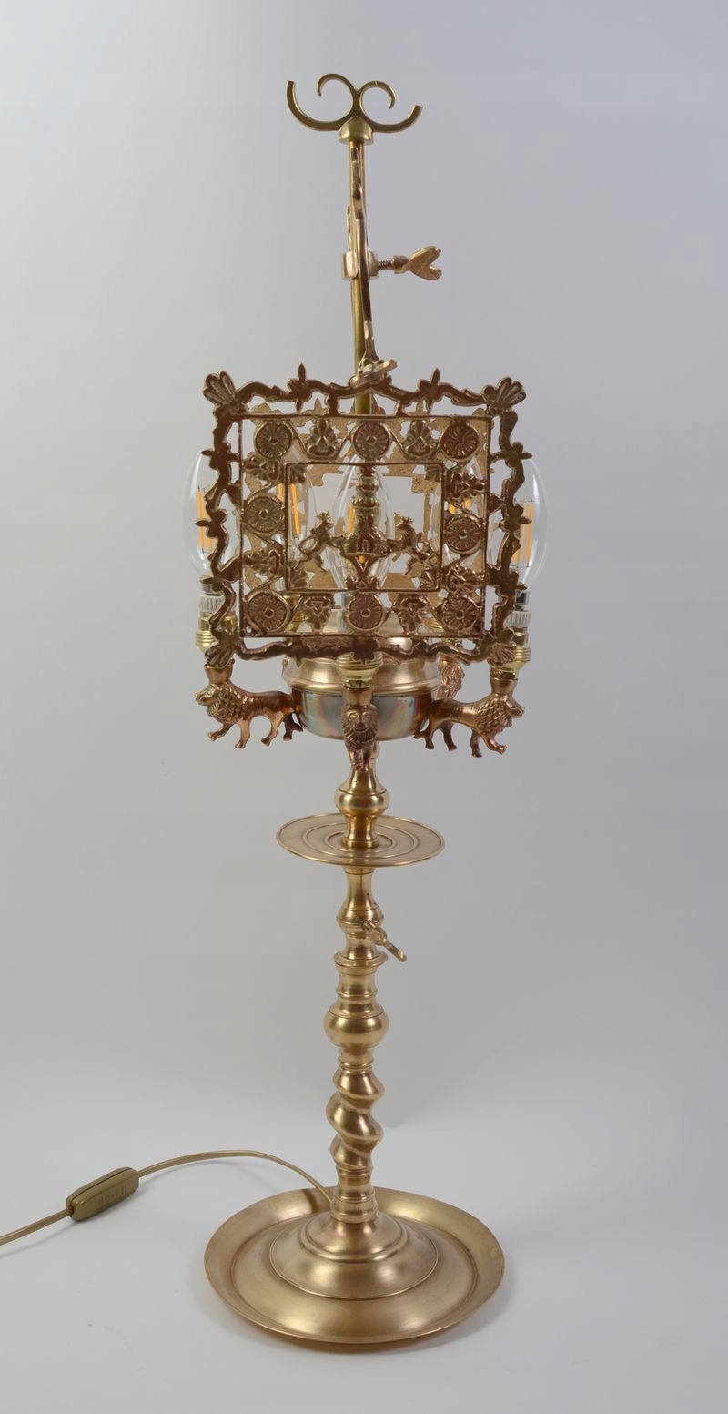 Предметом продажи является стильная старинная масляная лампа из Испании первой половины 20 века. Лампа электрифицирована – в результате она имеет пять световых точек, дающих большое количество света (лампочки Е-14). Каждый мельчайший элемент усовершенствован. Лампа изготовлена из бронзы золотистого цвета. Он оснащен всеми аксессуарами (которые слегка висят), необходимыми для работы масляной лампы. Изделие имеет достаточно устойчивое круглое декоративное основание, обеспечивающее безопасность. Светильник дополнительно украшен ажурными крышками и оригинальным концом дужек с фигуркой льва, что придает изделию уникальность. Светильник порадует каждого своей оригинальностью и добавит элегантности и стиля любому интерьеру. Однозначно рекомендую!!! Учитывая тот факт, что когда-то это была масляная лампа, часть, служащая канистрой, и крышка до сих пор являются подвижной частью. К светильнику прилагается сертификат галереи Россар, подтверждающий место и время происхождения предмета.