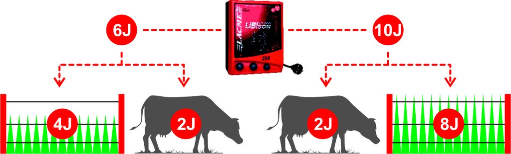 Прибор измеряет условия на заборе и регулирует доступную животному энергию так, чтобы она никогда не превышала норму, то есть 5000 мДж. При правильной установке ограждения доступного животному импульса всегда достаточно независимо от изменений погоды или уровня растительности, ведь энерджайзер сам регулирует энергию, которая понадобится для эффективного отлучения животного, доставляя ее в пределах нормы. Для правильной работы UBISON 10J требуется идеальное заземление на ограждении. Мы рекомендуем использовать до пяти заземляющих контактов.