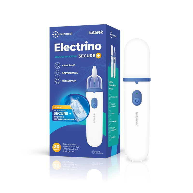 Вместе с Katarek Secure + соль Helpmedi Electrino создает полный набор для растворения выделений. , затем аспирация и увлажнение нежного носика ребенка. По методу 3-х ступенчатой аспирации.