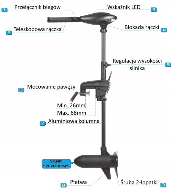 Колонна двигателя изготовлена из анодированного алюминия , устойчивой к коррозии , что обеспечивает долговечность долговечность и надежность , даже в сложных условиях воды.