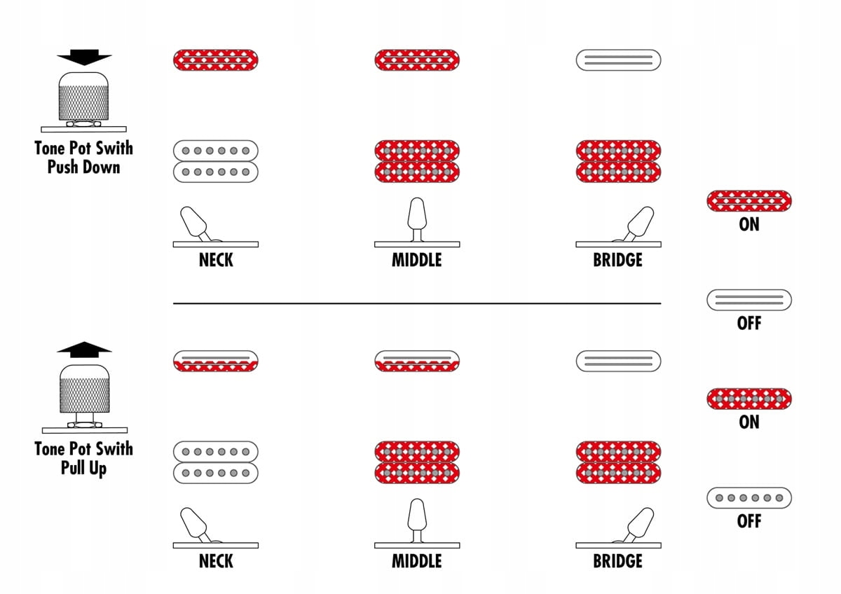 - Потенциометры: — громкость с переключателем фильтра верхних частот. (push-pull) - тон с переключателем CoilTap (push-pull)