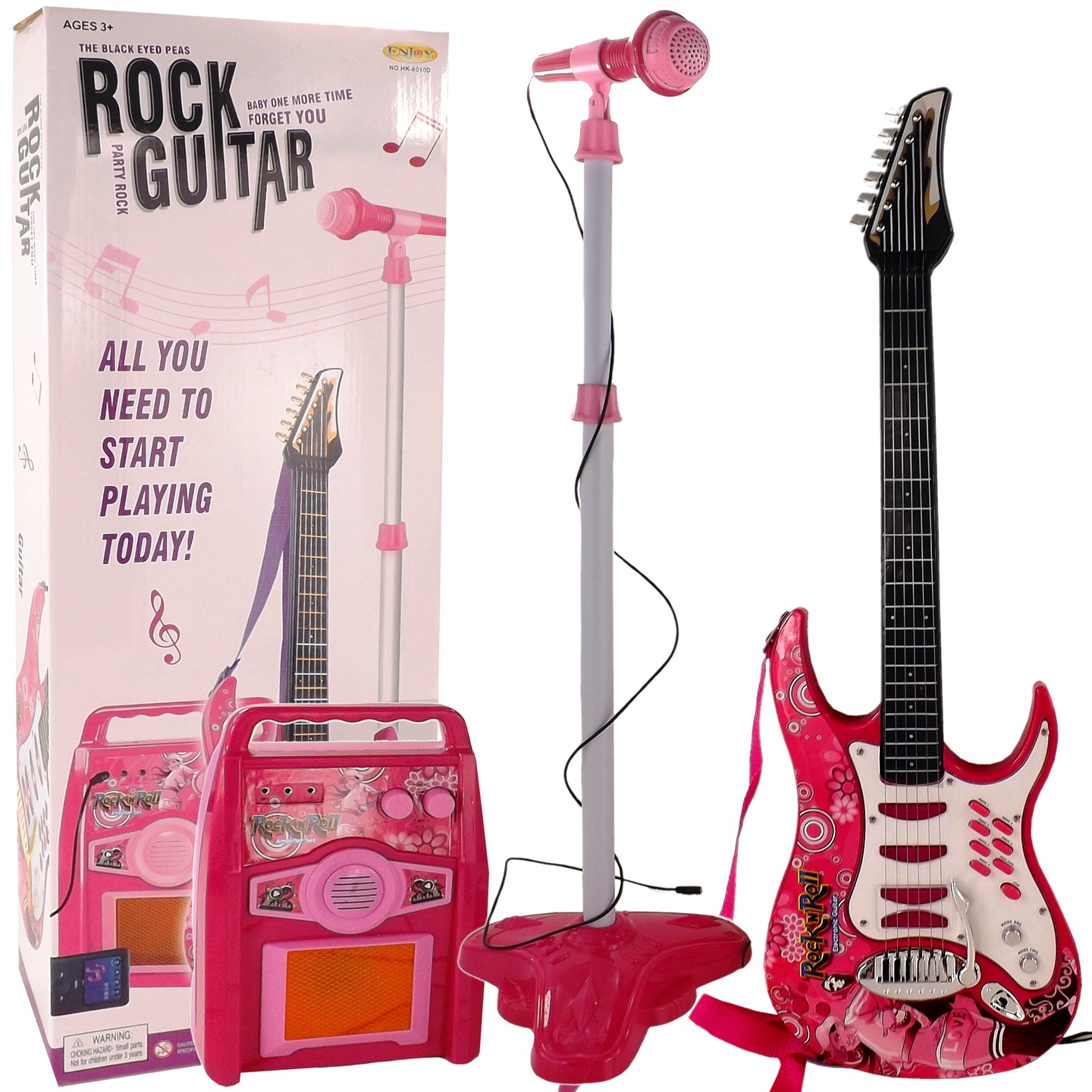 - Микрофон-усилитель для электрогитары 8010RMУ вас дома есть маленький музыкант? Эта гитара сделает веселье еще приятнее! Отличный набор для маленького артиста, мы поможем ему сделать первые шаги в музыке и на сцене перед публикой. Цвет: розовый. Размеры упаковки: 73 х 26 х 11 см. Размеры гитары. : высота: 73 см ширина: 25 см толщина: 4,5 см Батарейки: для гитары: 3 х АА (в комплект не входят) для усилителя: 3 х АА (в комплект не входят) Возраст: 3+ Игрушка сертифицирована CE, EN71 Размеры: Размеры гитары : высота: 73 см ширина: 25 см толщина: 4,5 см Длина гитарного кабеля: около 125 см Длина шейного ремня: около 90 см Длина струны: 50 см Размеры микрофонной стойки: самая низкая высота: 65 см максимальная высота: 109 см Размеры усилителя Размер: 26,5 х 19 х 8 см. Размеры микрофона: 21 х 6 см. Длина кабеля от микрофона: около 130 см. Длина MP3-кабеля: 63 см. В комплект входят: гитара с плечевым ремнем и кабель для подключения к усилителю, усилитель, микрофон с регулируемой стойкой, кабель для подключения МР3 или телефона (МР3 и телефон в комплект не входят). В комплект входит усилитель с динамиком. К гитаре необходимо подключить микрофон. усилитель с кабелями. Когда вы играете на гитаре или поете в микрофон, вы слышите это из динамика усилителя. Микрофон и гитара играют только через усилитель. У них нет своих динамиков. Их можно услышать только через динамик усилителя. Усилитель и гитара имеют подсветку, которая загорается во время игры и пения. Усилитель имеет 3 выхода: для гитары, для микрофона, для MP3 или телефонного кабеля (MP3 и телефон в комплект не входят). Усилитель имеет регулятор громкости. Лампа загорается во время проигрывания мелодии. Гитара имеет 6 металлических струн. На них можно играть кончиками пальцев или стилусом (не входит в комплект). Струны не регулируются и не настраиваются. Они издают игрушечный металлический звук. Гитара имеет переключатель ВКЛ/ВЫКЛ. Микрофон имеет длинный кабель, который необходимо подключить к усилителю. Микрофон имеет переключатель ВКЛ/ВЫКЛ. Микрофон слегка усиливает голос. Регулируемый штатив с большим основанием позволяет регулировать высоту под ребенка. С помощью кабеля, входящего в комплект, можно подключить MP3-плеер или телефон и воспроизводить с него музыку или треки караоке. Гитара имеет длинный шейный ремень. Функции всего набора: 6 металлических струн на гитаре, шейный ремень на гитаре, регулировка громкости, выбор тембра, рычаг, 6 мелодий, регулировка демо, темп, выбор остановки, функция дема ВКЛ/ВЫКЛ на гитаре, усилитель и микрофон. Набор упакован в красивую красочную коробку, идеальную для подарка.