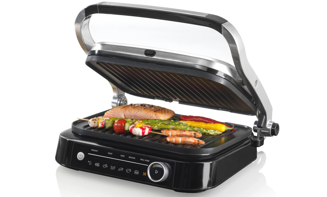 Устройство оснащено большой поверхностью для гриля площадью 744 см2. Крышка открывается на 180 градусов, что позволяет готовить еду на двойной поверхности. Варочная панель имеет антипригарное покрытие, поэтому ее легко содержать в чистоте, не нужно беспокоиться о прилипании или пригорании остатков пищи. Имеет возможность разборки, поэтому его можно легко промыть под проточной водой.