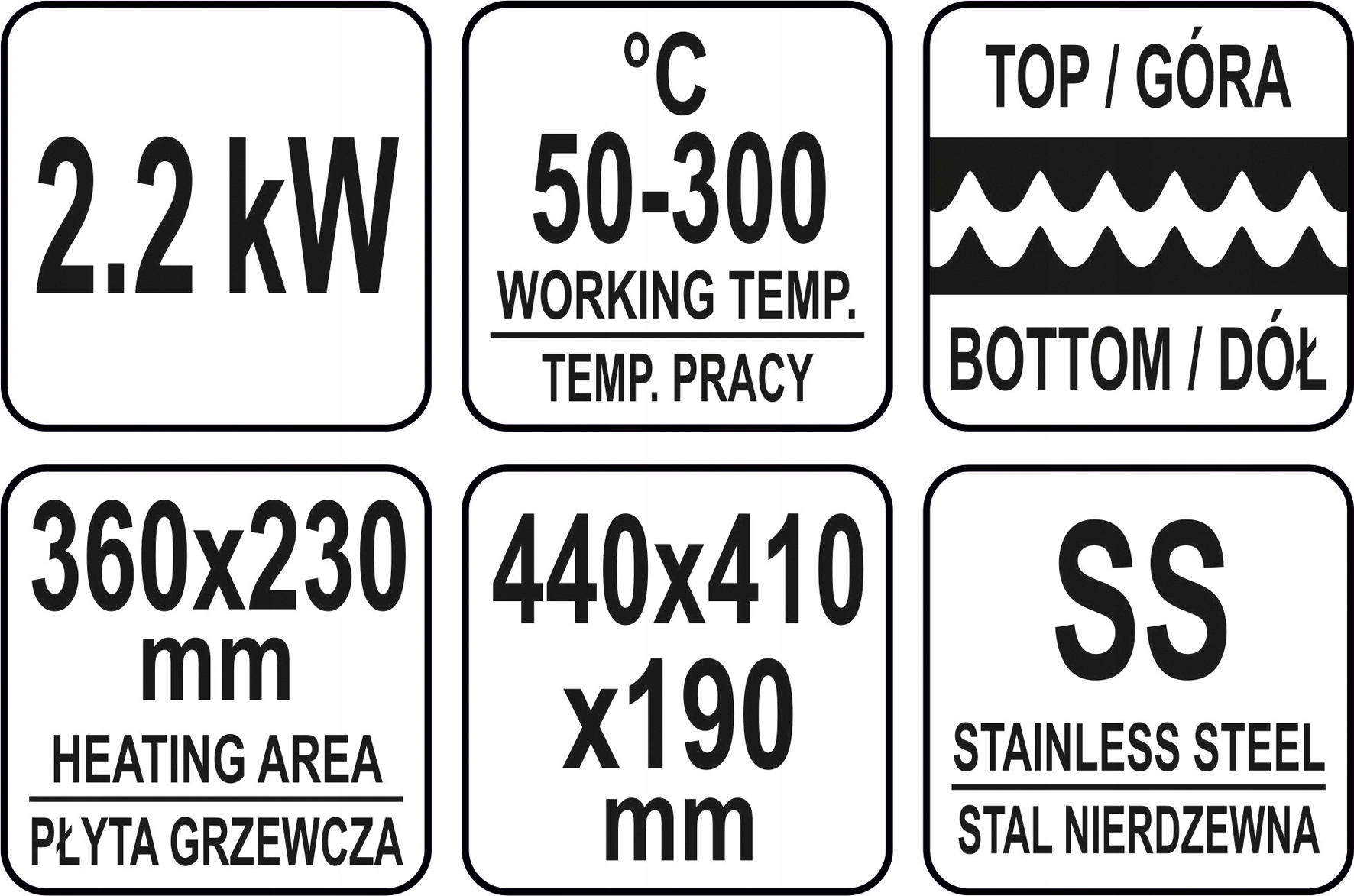 Нагреватель мощностью 2,2 кВт управляется потенциометром, расположенным на передней панели. Можно установить рабочую температуру в диапазоне 50~300℃. Установленный брызгозащищенный выключатель позволяет выключать гриль, когда он не используется, без необходимости отключения кабеля питания от сети. Гриль питается от сети 230 В~50 Гц.