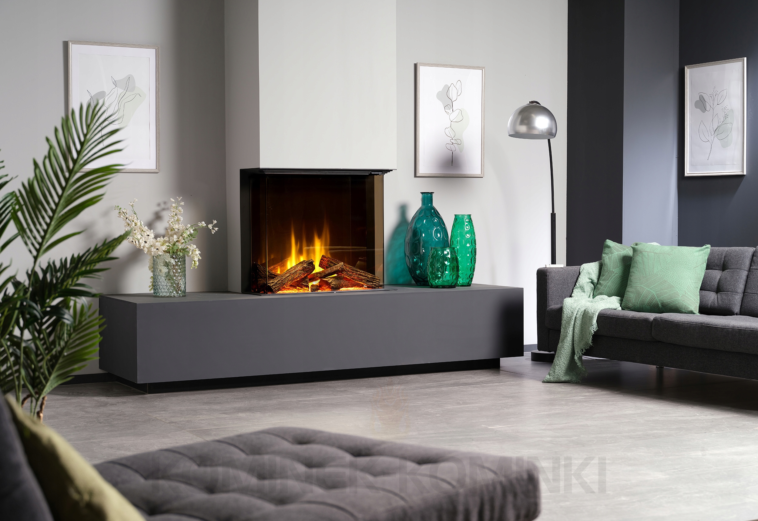 - Оформление очага: Подсвеченные поленья и стеклянная крошка