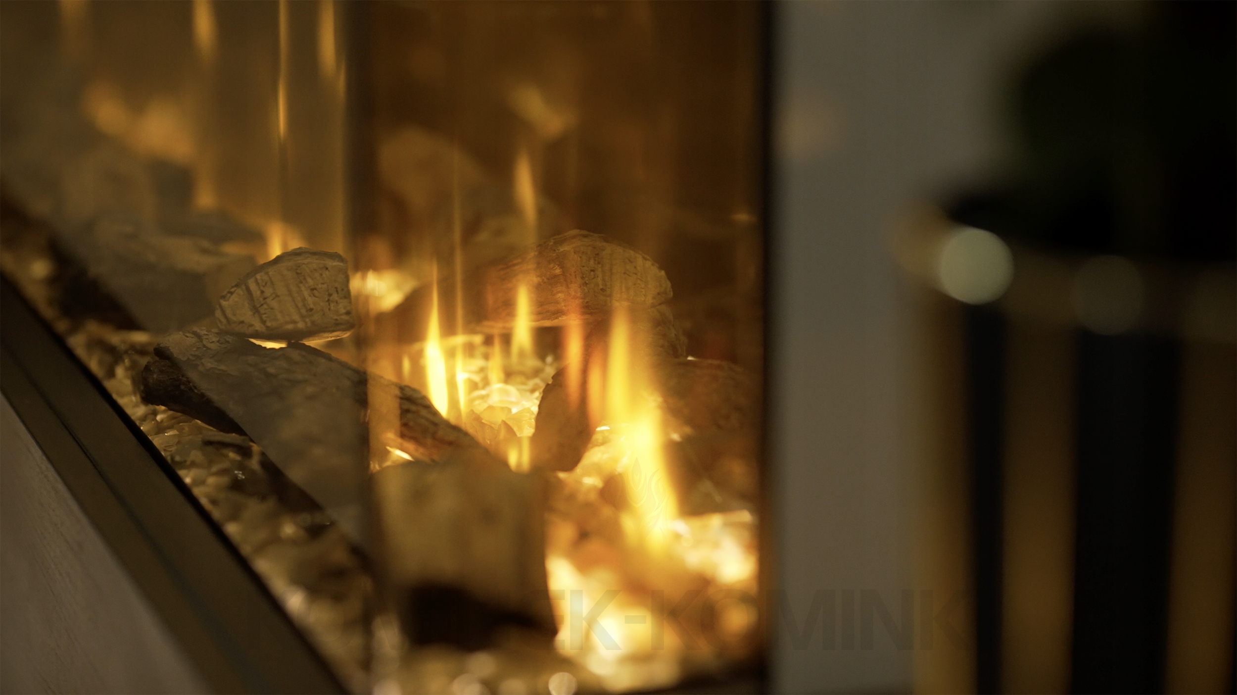 большой обзор камина благодаря стеклу, идеально прилегающему к краю камина.