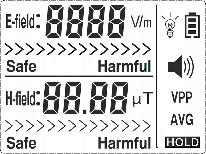 - порог тревоги: 40 В/м (электрическое поле), 0,4 мкт (магнитное поле) 0,4 секунды
