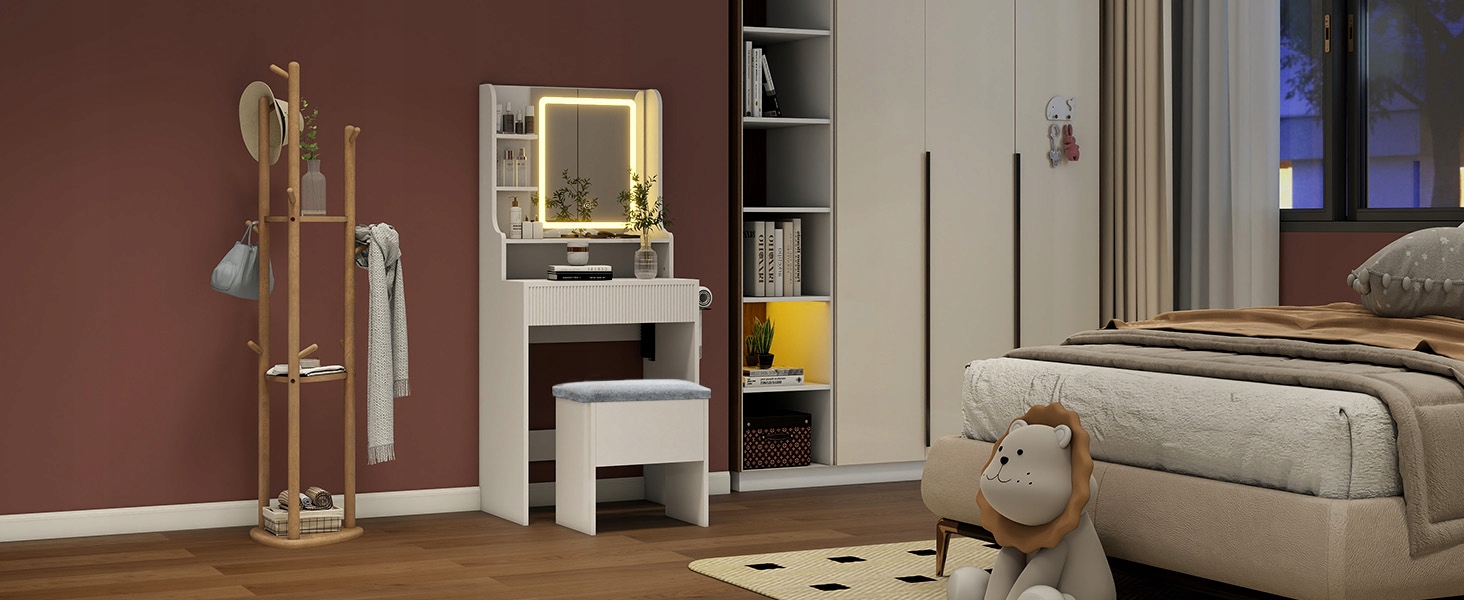 3-слойная полка рядом с зеркалом: может использоваться для размещения небольших средств по уходу за кожей или косметики, такой как губная помада, тональный крем, тени для век и т. д., для ежедневного использования. Также можно разместить небольшие украшения, чтобы подчеркнуть красоту туалетного столика.