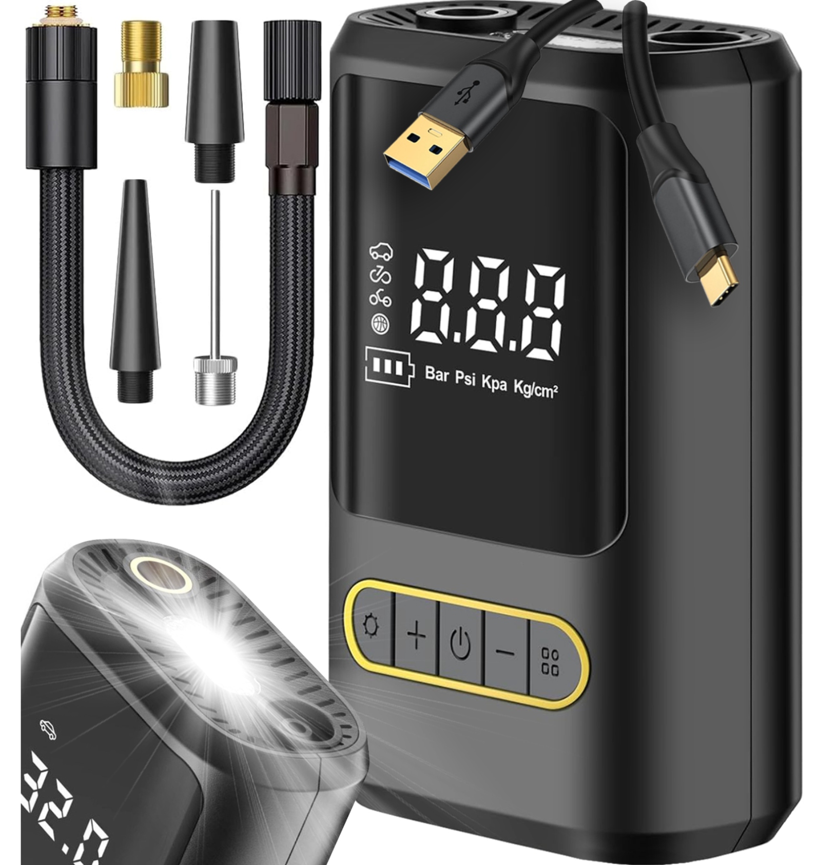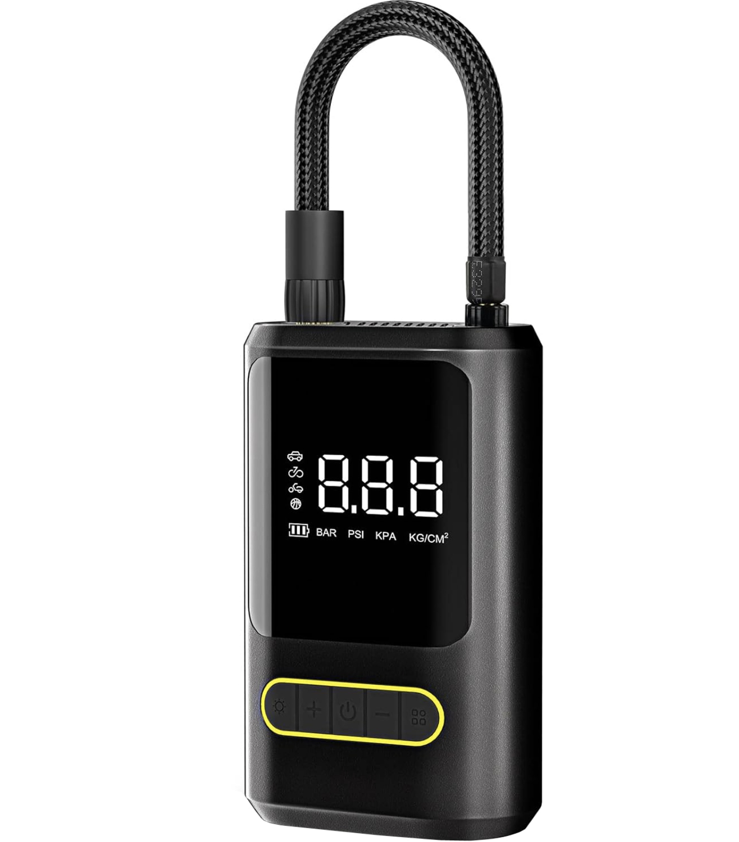 ➡️ На большом ЖК-дисплее отображается текущее давление, выбранный режим работы (автомобиль, велосипед, мяч) и состояние аккумулятора. Интуитивное управление и полный контроль над прокачкой!
