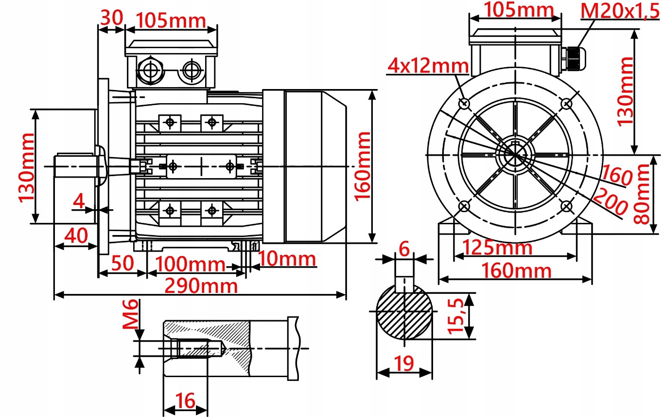 - Расстояние между противоположными отверстиями (4x Φ12) во фланце: 160 мм