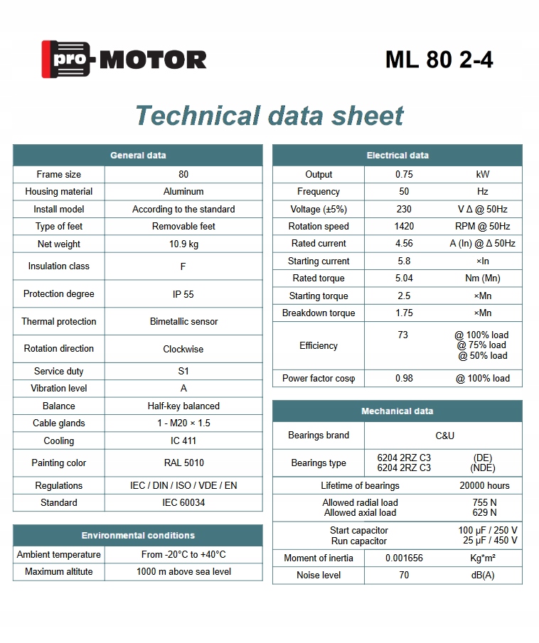 Электродвигательный однофазный промотор ML 0,75 кВт 1400 об / мин. 80 B14