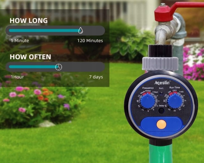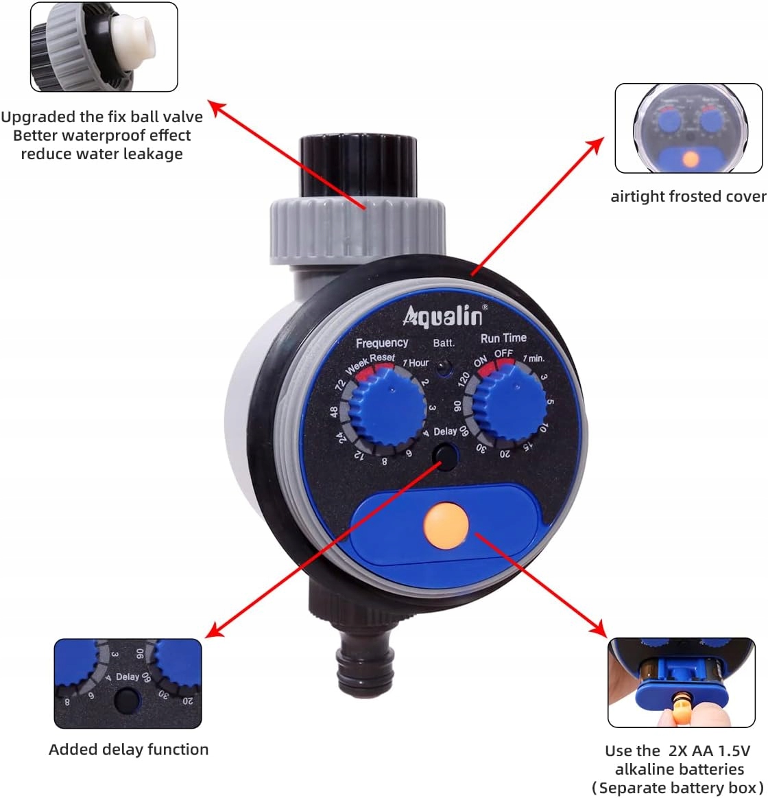 - 【Техническое обновление】: по сравнению с традиционным таймером шарового крана, ирригационным компьютером, улучшенная функция шарового клапана (лучшая герметичность), функция задержки времени (максимальная экономия воды) и функция батареи (конструкция батарейного отсека большей емкости: только 2 щелочные батарейки типа АА по 1,5 В могут использовать - не входят в комплект).