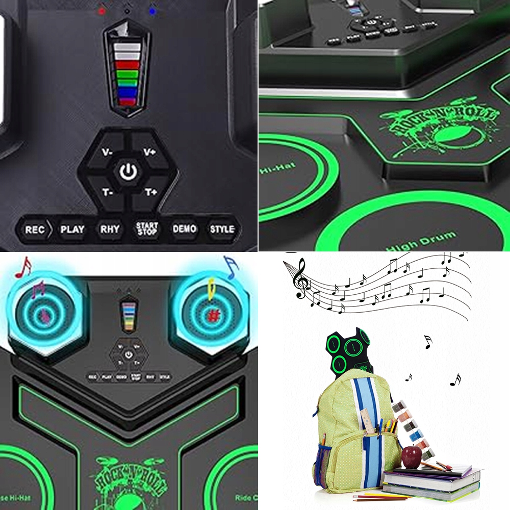 Складная электронная ударная установка – идеальный инструмент для всех любителей ритма, начинающих барабанщиков, а также людей, которые путешествуют и не хотят отказываться от возможности играть на барабанах. Оборудование идеально подходит для обучения и развлечения. Это позволяет развивать соответствующие двигательные навыки, связанные с удержанием и перемещением палочек, а также ритмические.