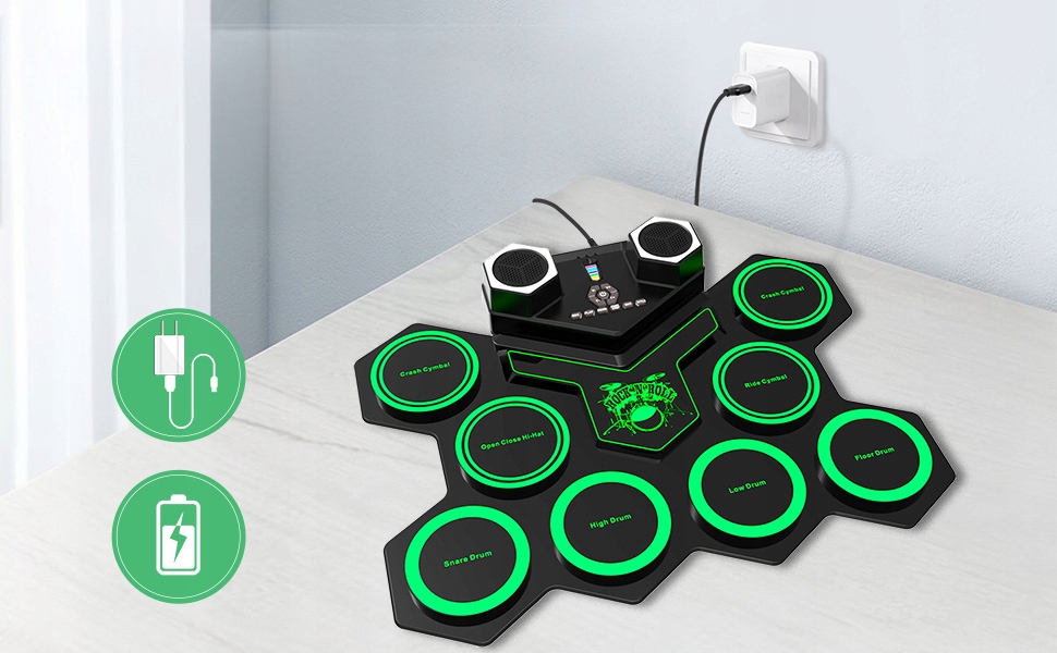 В комплект входят все аксессуары, необходимые для того, чтобы начать играть на барабанах — барабанный пэд, барабанные педали, барабанные палочки, USB-кабель для зарядки, аудиокабель AUX, чистящая ткань, руководство пользователя (английский язык не гарантируется). Эта ударная установка подойдет не только новичкам от 3 лет, но и станет прекрасным подарком на день рождения, Хэллоуин, Рождество или другие особые случаи.