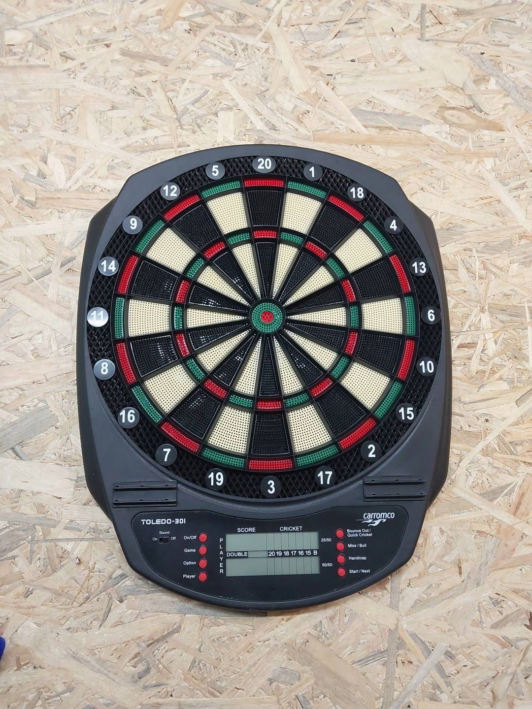 ЭЛЕКТРОННАЯ ПЛАТА CARROMCO TOLEDO-301 с адаптером. Электронная доска для дартса с 1 огромным ЖК-экраном, для 1–8 игроков, традиционных цветов, с 3 сегментами лунок. 43 игры и 320 вариаций.