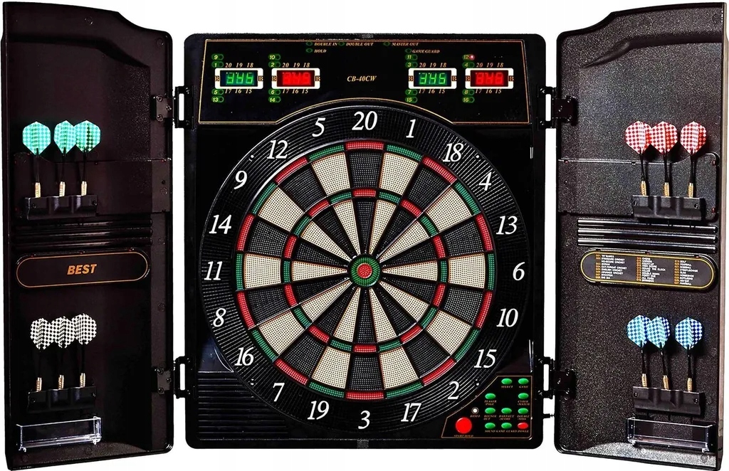 Лучший спортивный Dart Oxford с 27 играми в 159 вариантах оснащен цифровыми звуковыми эффектами с контролем громкости. Четыре экономичные светодиодные дисплеи Electric Dart Shield показывают состояние игры до 16 отдельных игроков или 8 команд с 2 игроками. На внутренних страницах высококачественной пластиковой двери с появлением древесины грецкого ореха есть ручки, в которых вы можете спрятать 12 дротиков и запасных пещер.