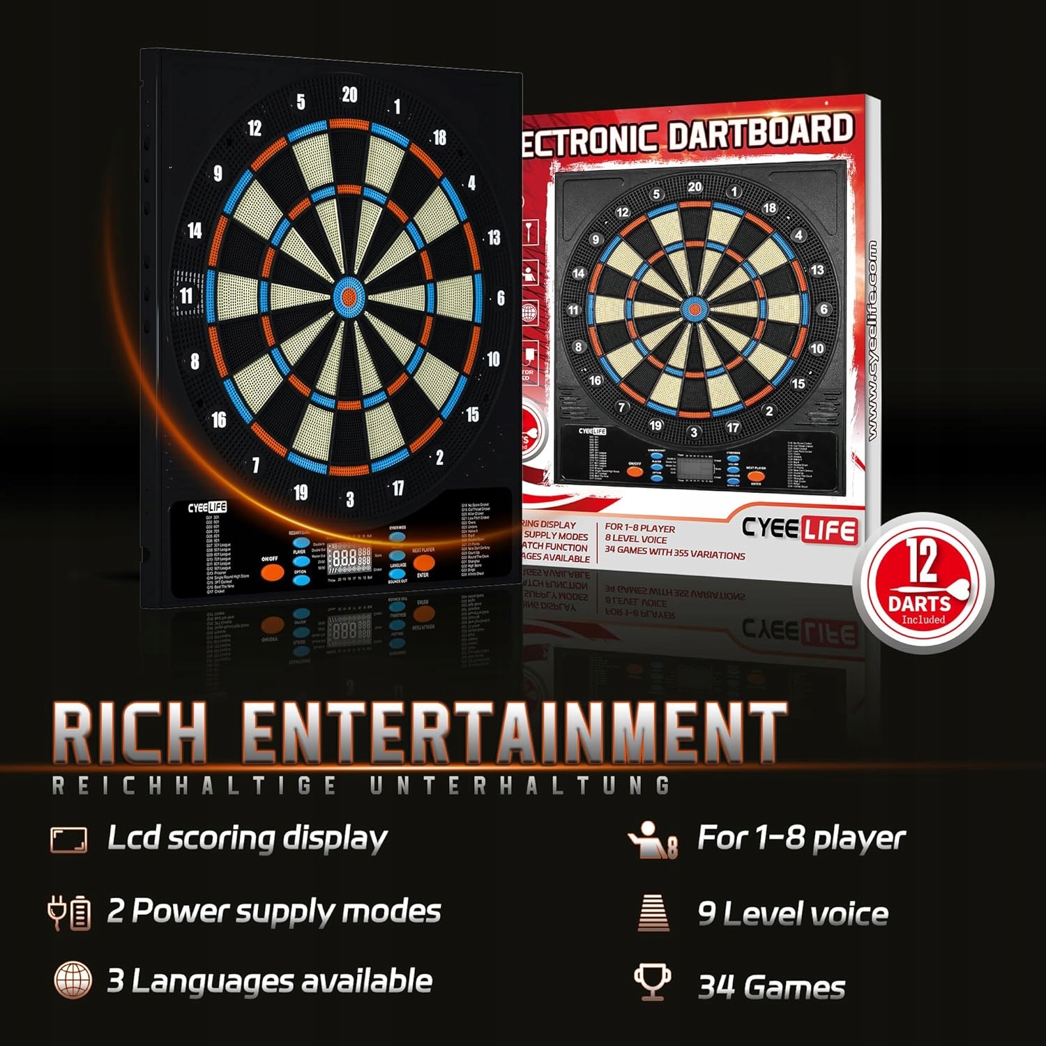 Доска для дартса CyeeLife отличается электронной системой подсчета очков, что значительно упрощает отслеживание результатов во время игры. Это позволяет вам сосредоточиться на стратегии и совершенствовании своих навыков без лишнего стресса, связанного с расчетами. Это отличный способ улучшить свои навыки игры в дартс!