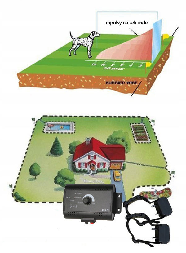 - передатчика электронного ручки для собаки имеют кабельный вход в сад, создающего шлюп. На передатчике обычно можно определить ширину зоны вокруг развернутого кабеля, где система начинает реагировать на появление собаки. Сам кабель может быть похоронен, скрыт под корой или ткани, например, в заборную сетку. Конечно, это также может лежать прямо на земле. Если собака движется дальше к кабелю и попадает в досягаемость следующей зоны, называемой импульсной зоной, электронный воротник запускает неприятный электростатический импульс , который заставляет питомца покинуть область путем неприятного напряжения мышц собаки