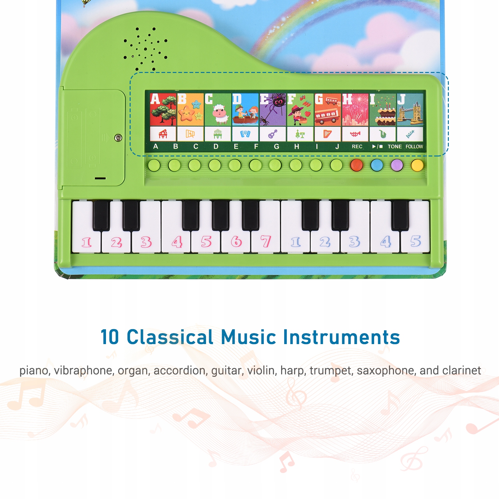 - 10 кнопок популярных детских песен: 10 кнопок A-J обозначают 10 видов песен, чтобы ваш ребенок мог выбрать свою любимую мелодию.