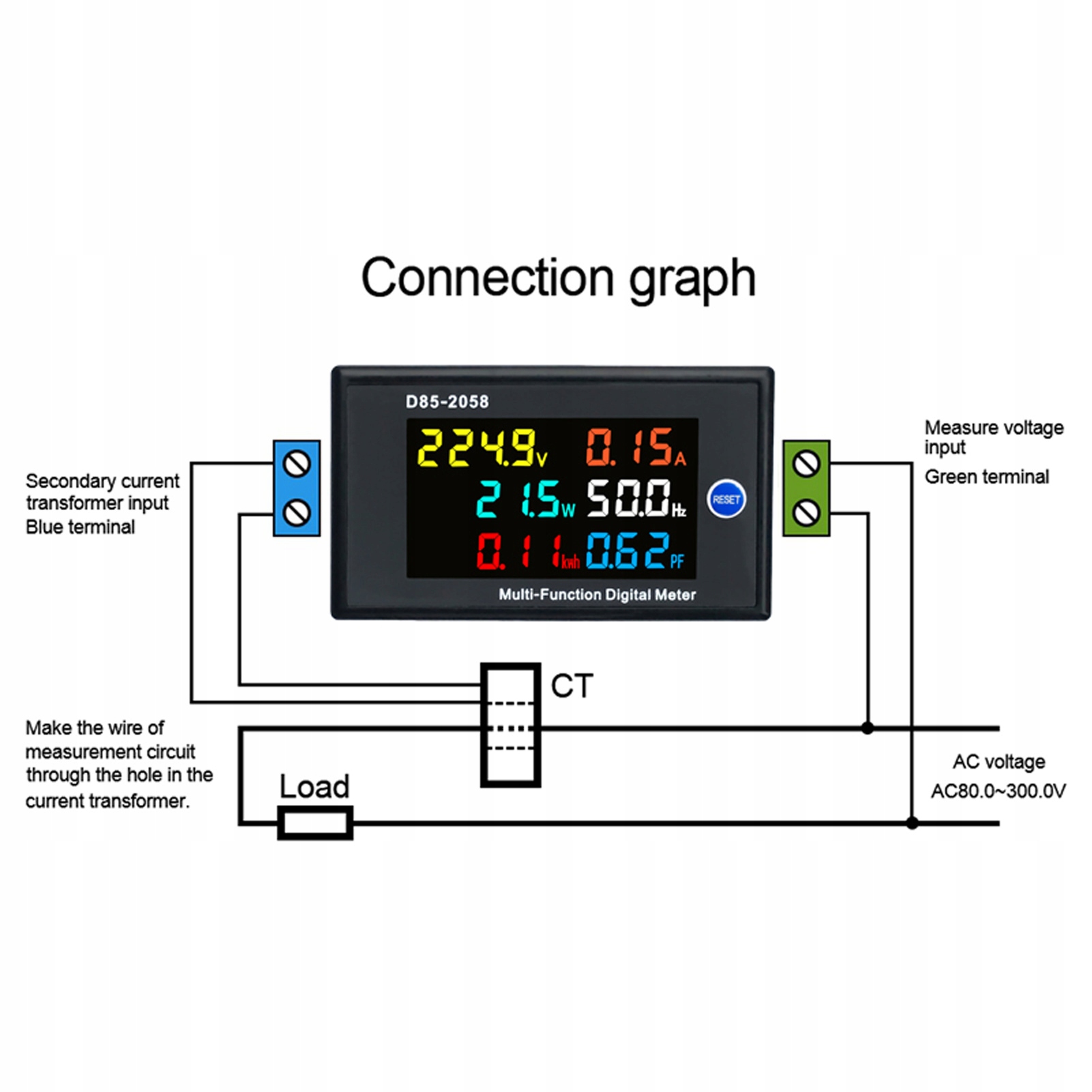 - Функция памяти: когда счетчик отключается во время использования, сохранение сохранения мощности измерителя будет сохранено в отдельности (предыдущие данные о энергии будут сохранены).